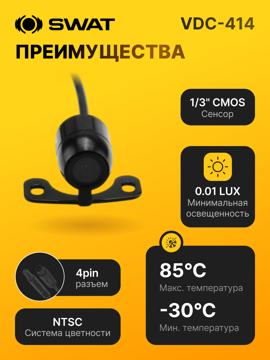 Универсальная камера заднего вида SWAT VDC-414 / CMOS PC7070 / угол обзора 120 градусов / парковочные линии информация: