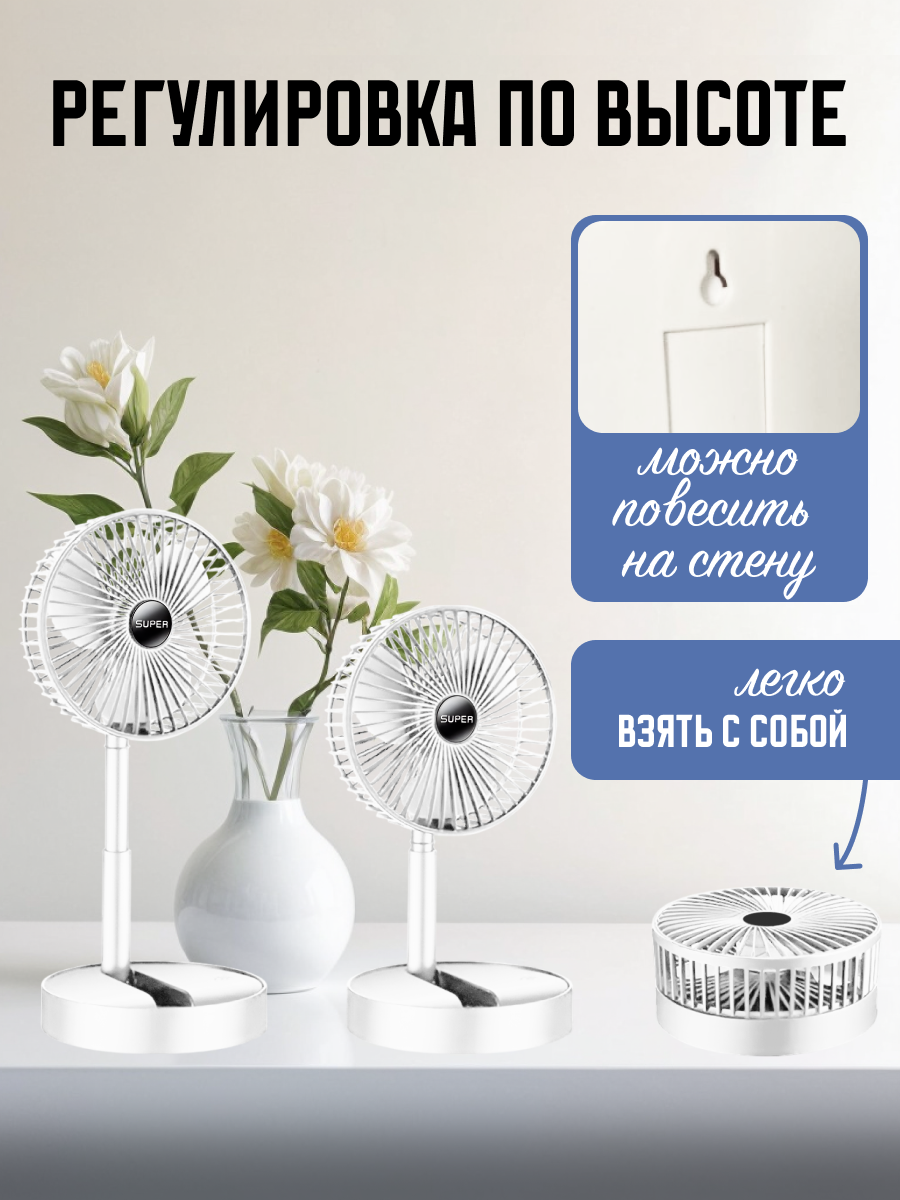 Вентилятор Power bank, складной, портативный, 5 скоростей работы, 3000 мАч, белый