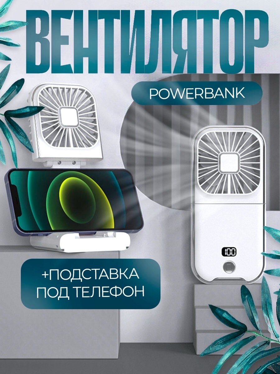 Вентилятор ручной бесшумный портативный мощный, беспроводной с павербанком Vent2 White белый информация:
