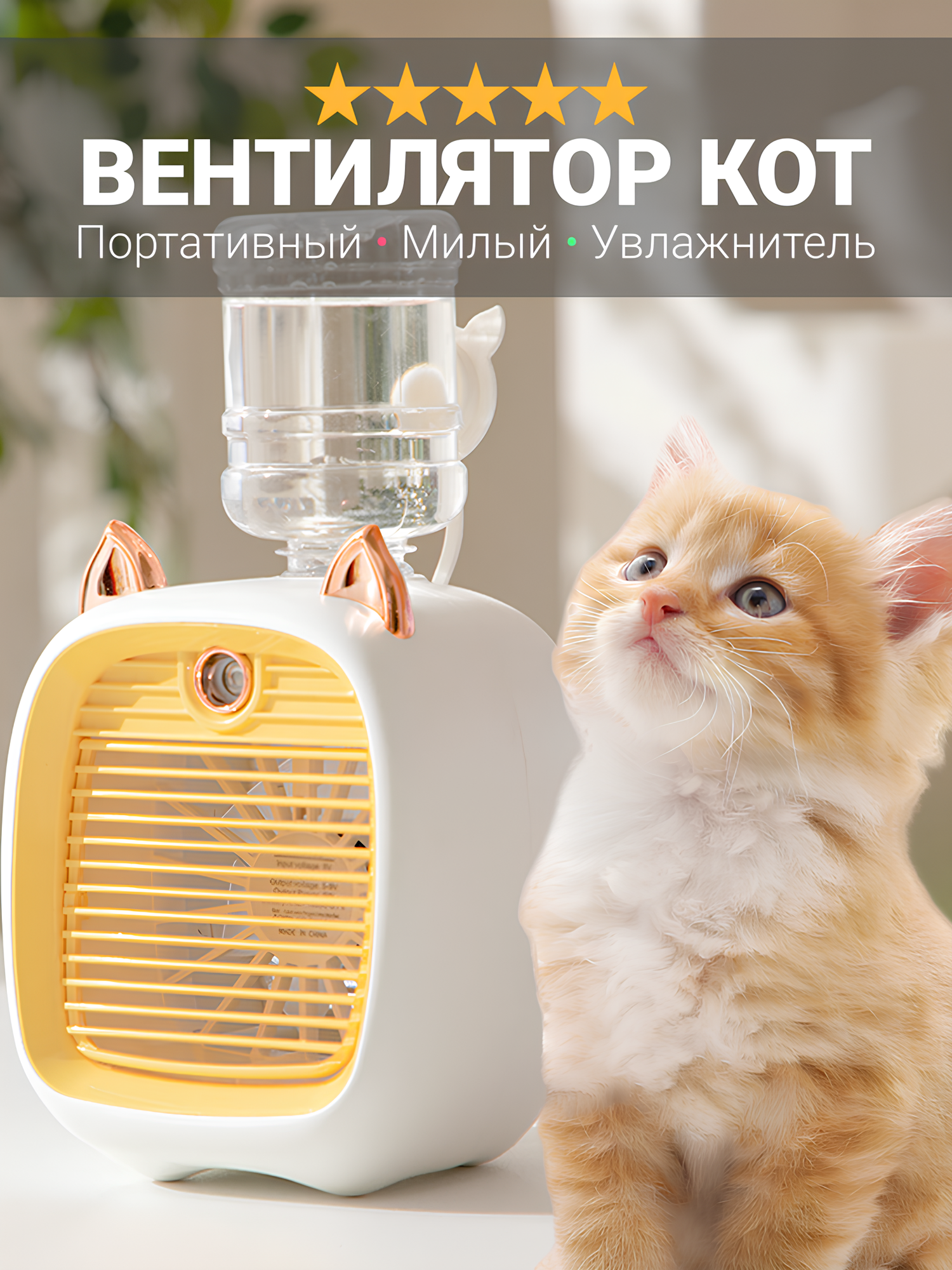 Отзывы на Вентилятор портативный от аккумулятора "Котик", 3 режима скорости с увлажнителем воздуха, желтый