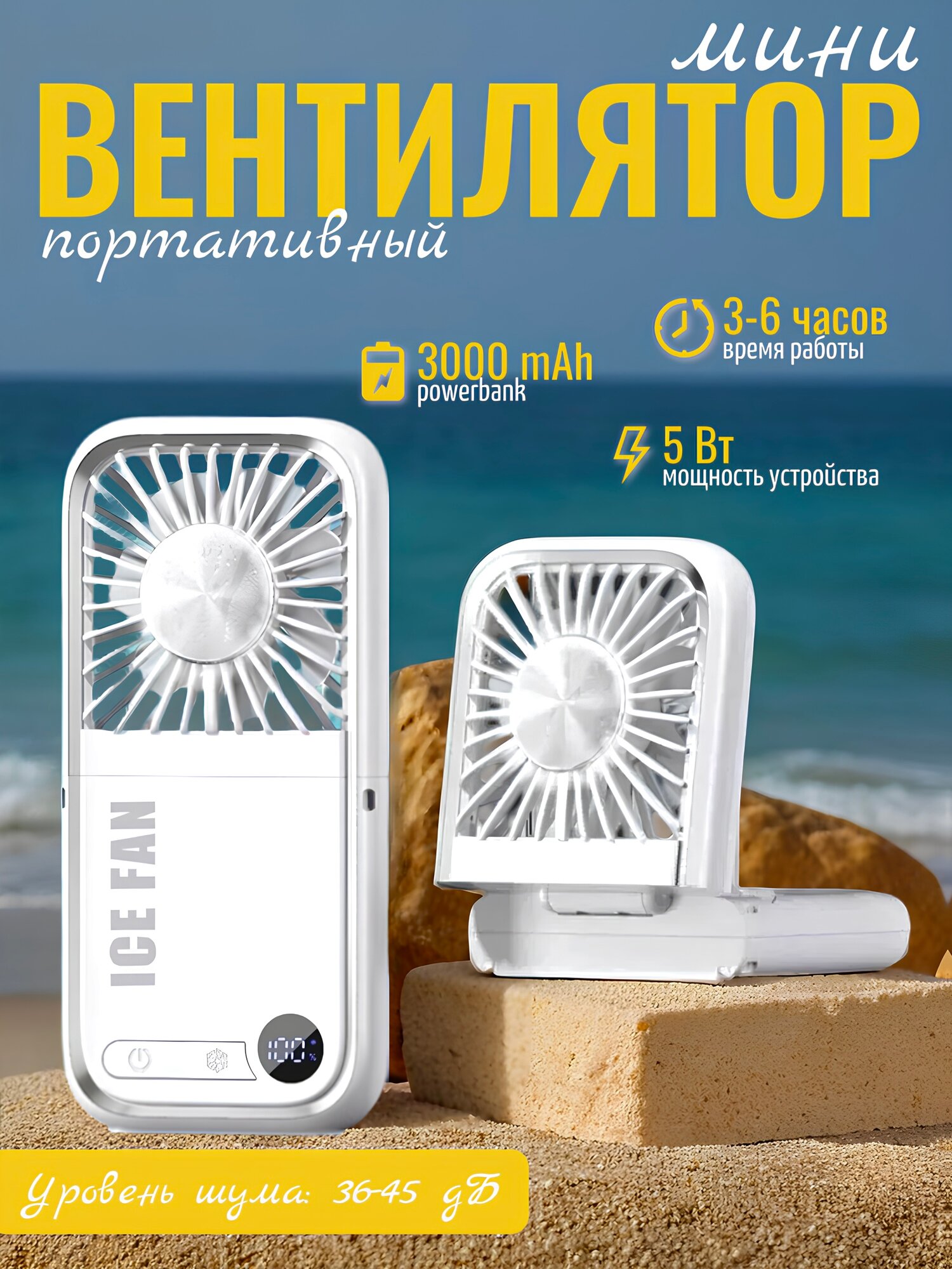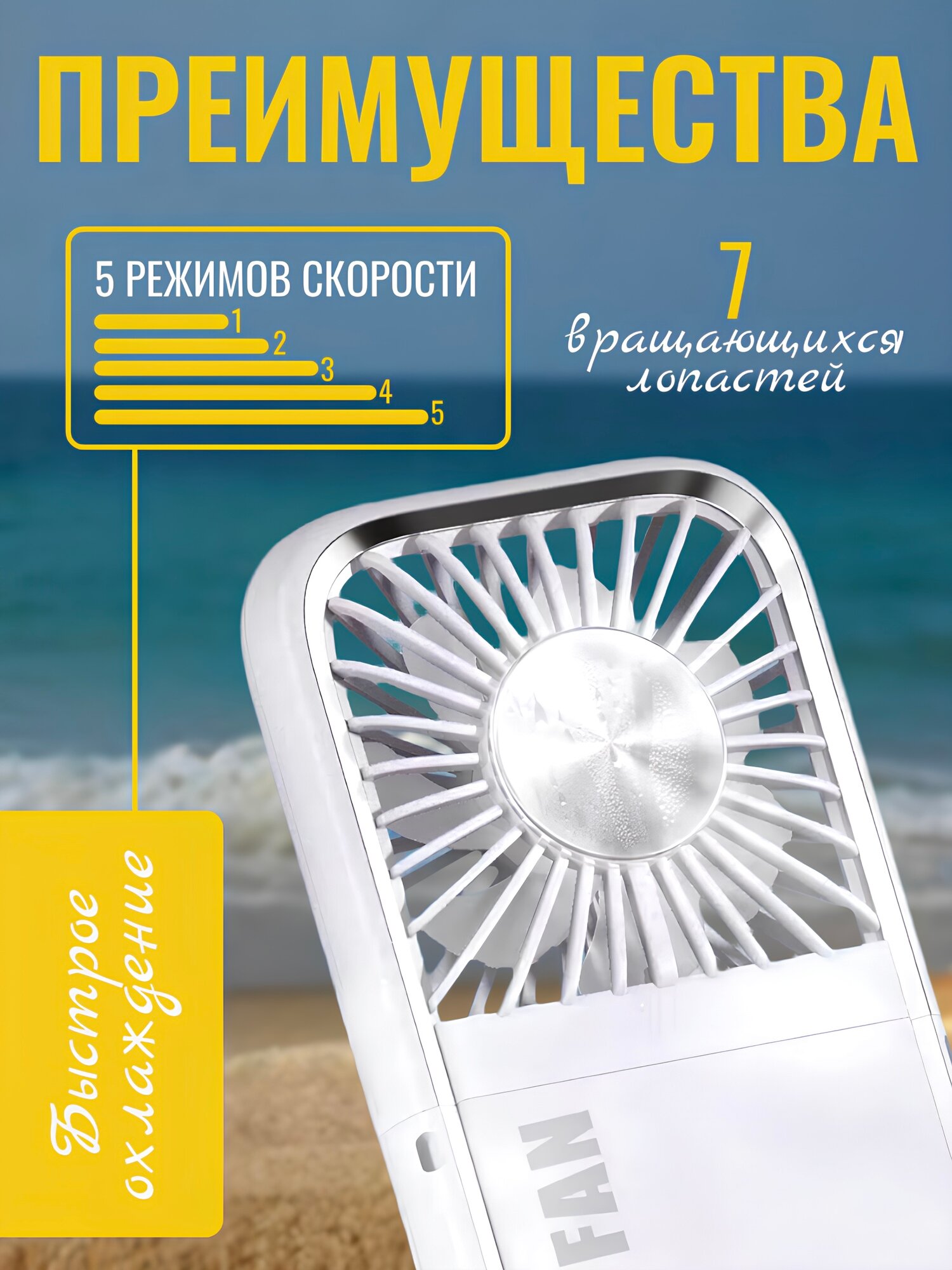 Мини вентилятор ручной портативный на аккумуляторе повербанк, белый информация: