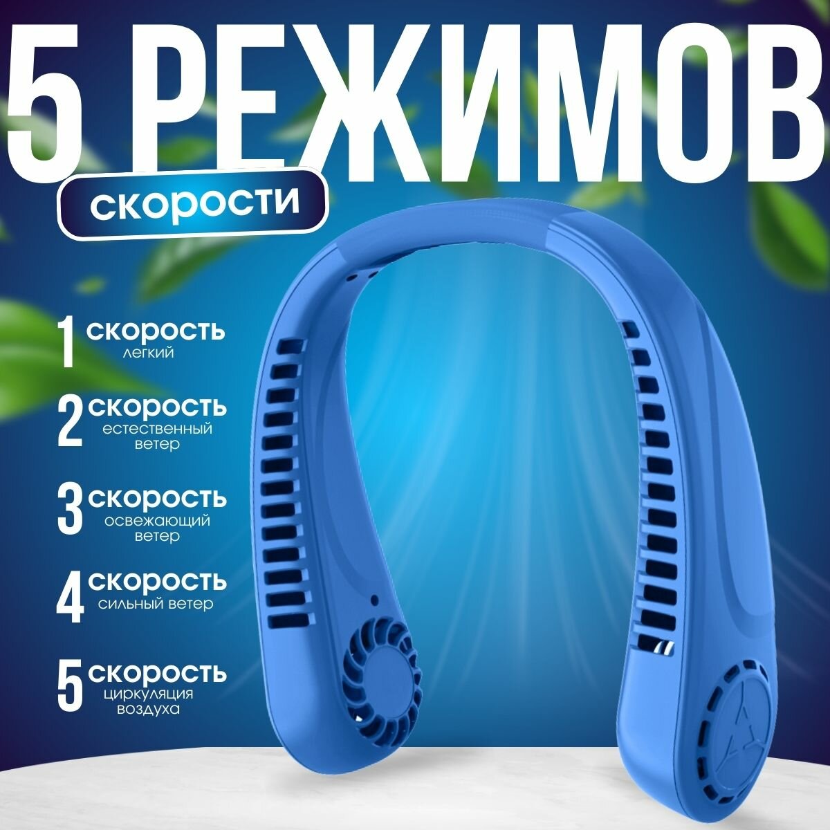 Подвесной синий вентилятор с аккумулятором 3000 mAh и 5 скоростями информация: