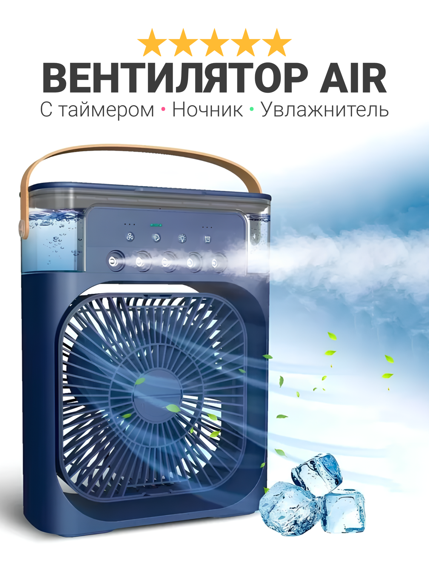 Отзывы на Портативный вентилятор с увлажнителем воздуха AirCooler, ночник-подсветка RGB 3 режима обдува, синий