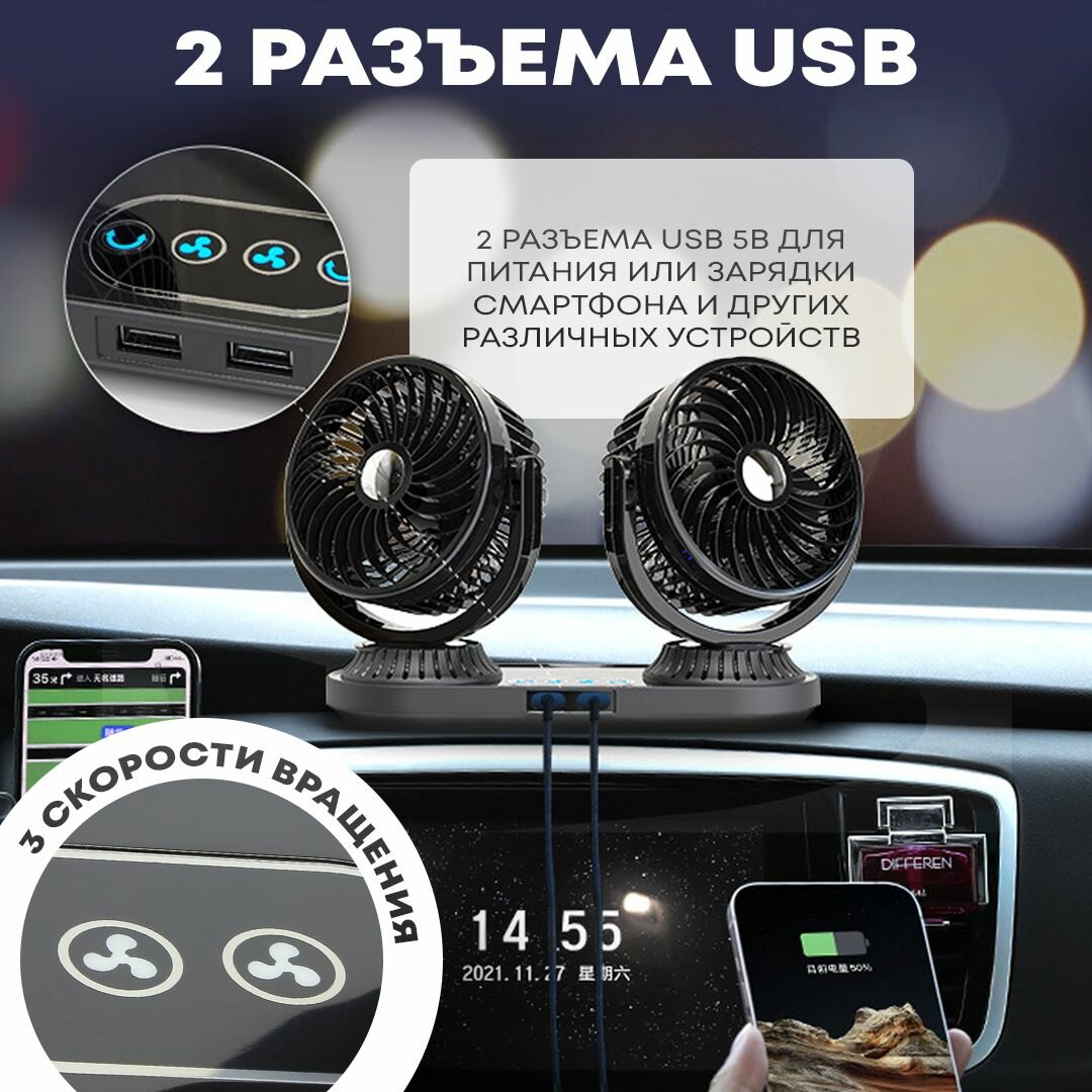 Автовентилятор двойной d-150 мм, автомобильный вентилятор от прикуривателя 12-24В, с USB разветвителем