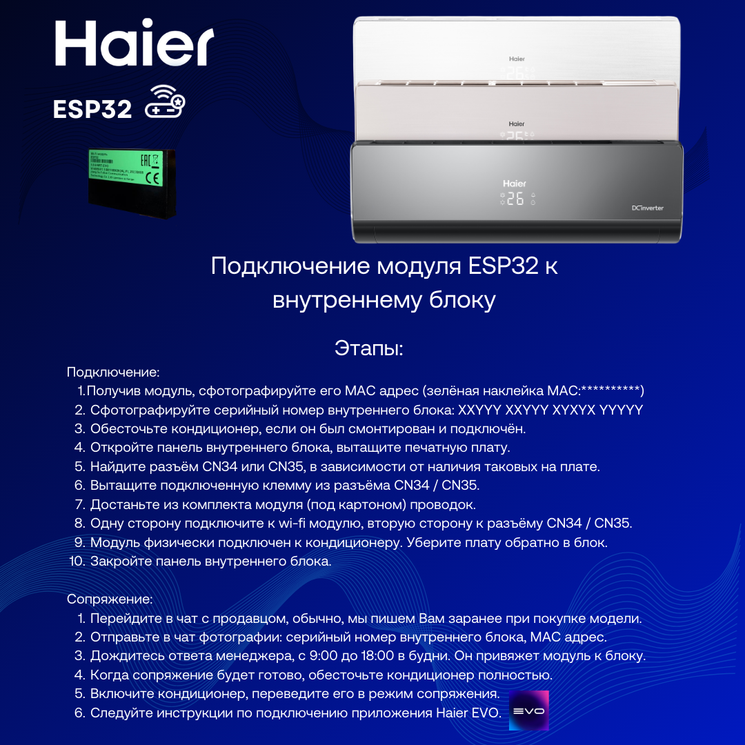 Инверторная сплит-система Haier Lightera AS09NS6ERA-W / 1U09BS3ERA с Wi-Fi модулем ESP32 на 25 м² информация: