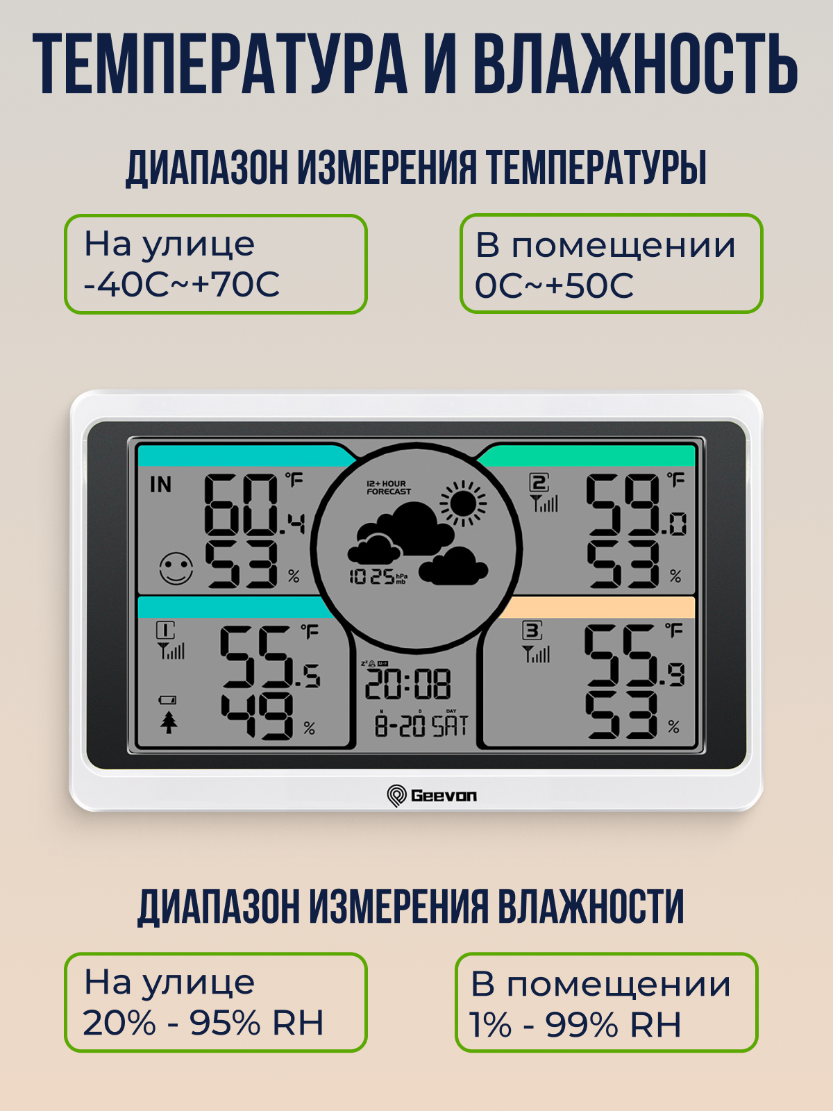 Метеостанция GEEVON, многозонная, 3 беспроводных датчика, с часами, прогноз погоды информация: