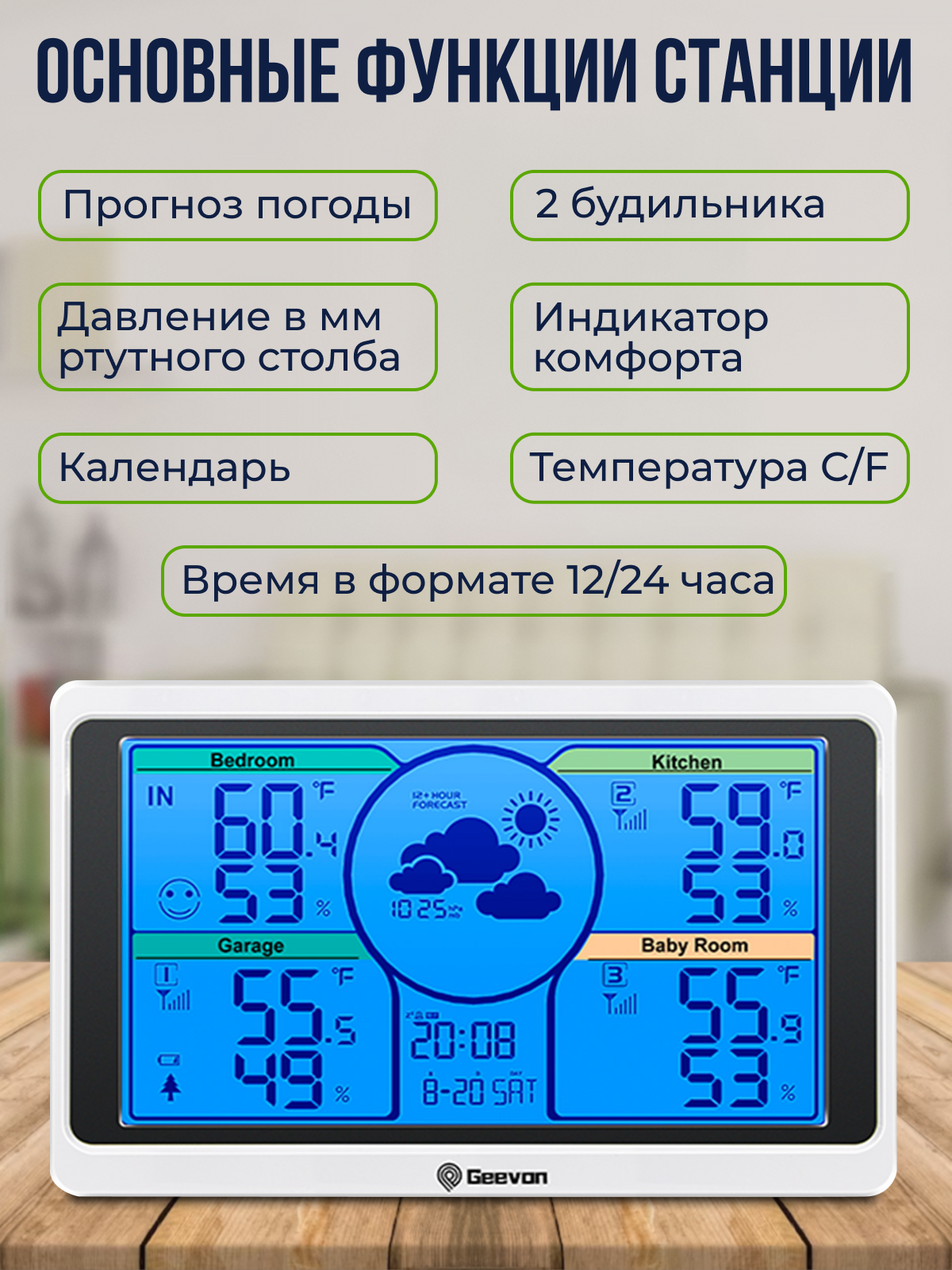 10 цен на Метеостанция GEEVON, многозонная, 3 беспроводных датчика, с часами, прогноз погоды