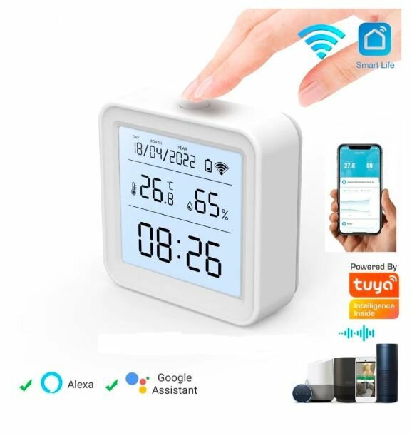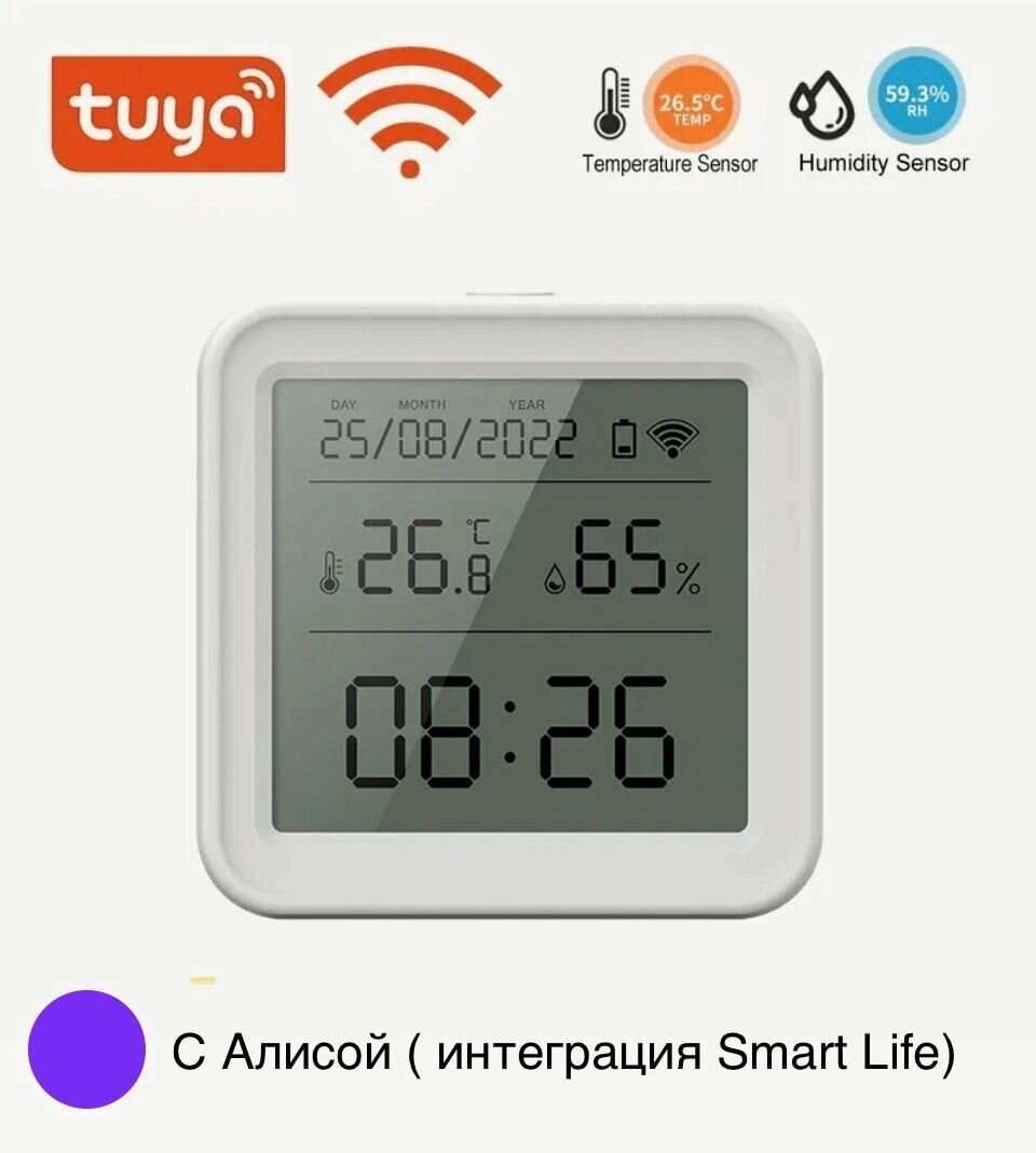 Датчик температуры и влажности. С Алисой через Smart Life. Гигрометр. WiFi.+Батарейки. Дисплей черно-белый. Календарь информация: