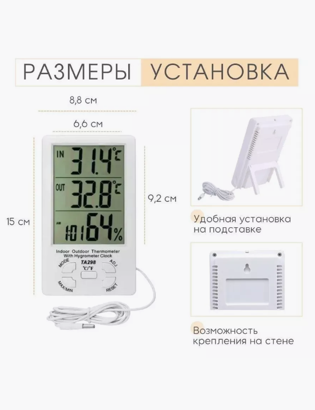 Термометр-гигрометр TA-298 Global, проводной датчик, белый, настольный/настенный, на батарейках информация: