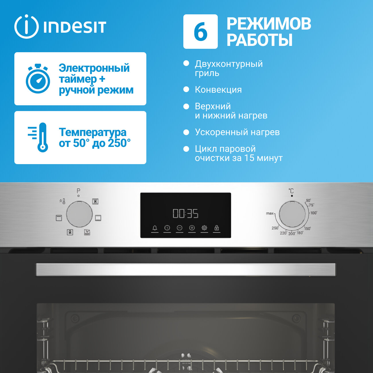 10 цен на Электрический духовой шкаф Indesit, 6 режимов, гриль, конвекция, таймер, дисплей, очистка паром, метал. направляющие