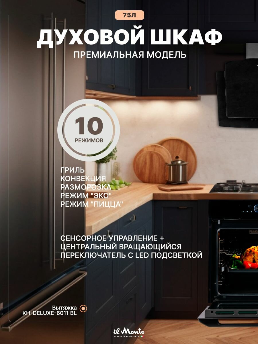 Духовой шкаф электрический встраиваемый, 75 л, Тройное стекло, Управление Wi-Fi, 10 режимов, Конвекция, Разморозка, il Monte BO-77 информация: