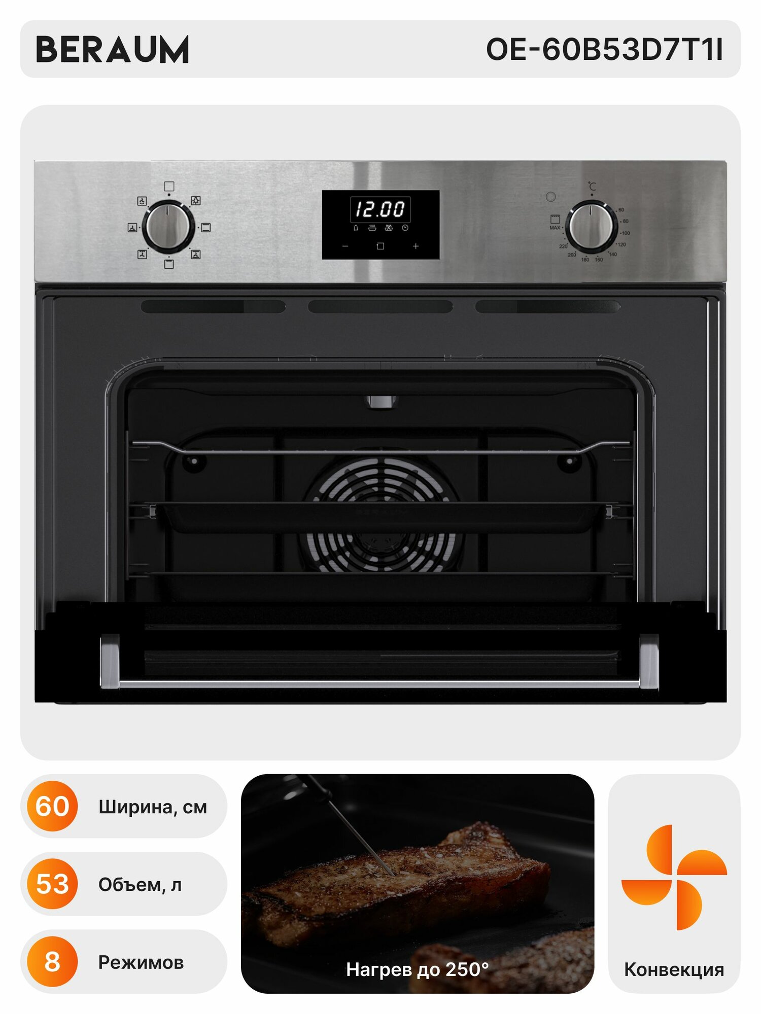 Отзывы на Электрический духовой шкаф Beraum OE-60B53D7T1I c конвекцией и грилем, 53 литра, утапливаемые переключатели, дисплей, телескопические направляющие