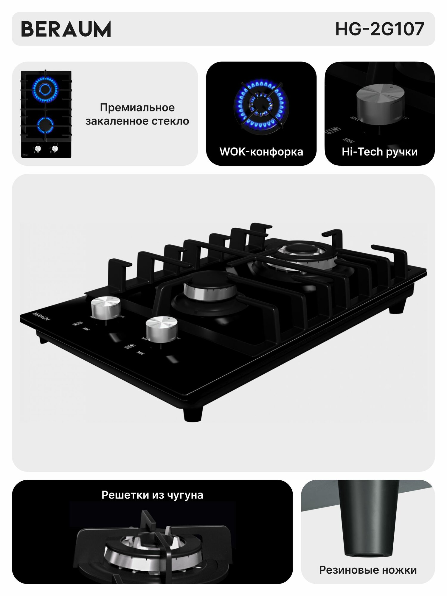 Газовая варочная панель Beraum HG-2G107, 2 конфорки, газ-контроль, черный информация: