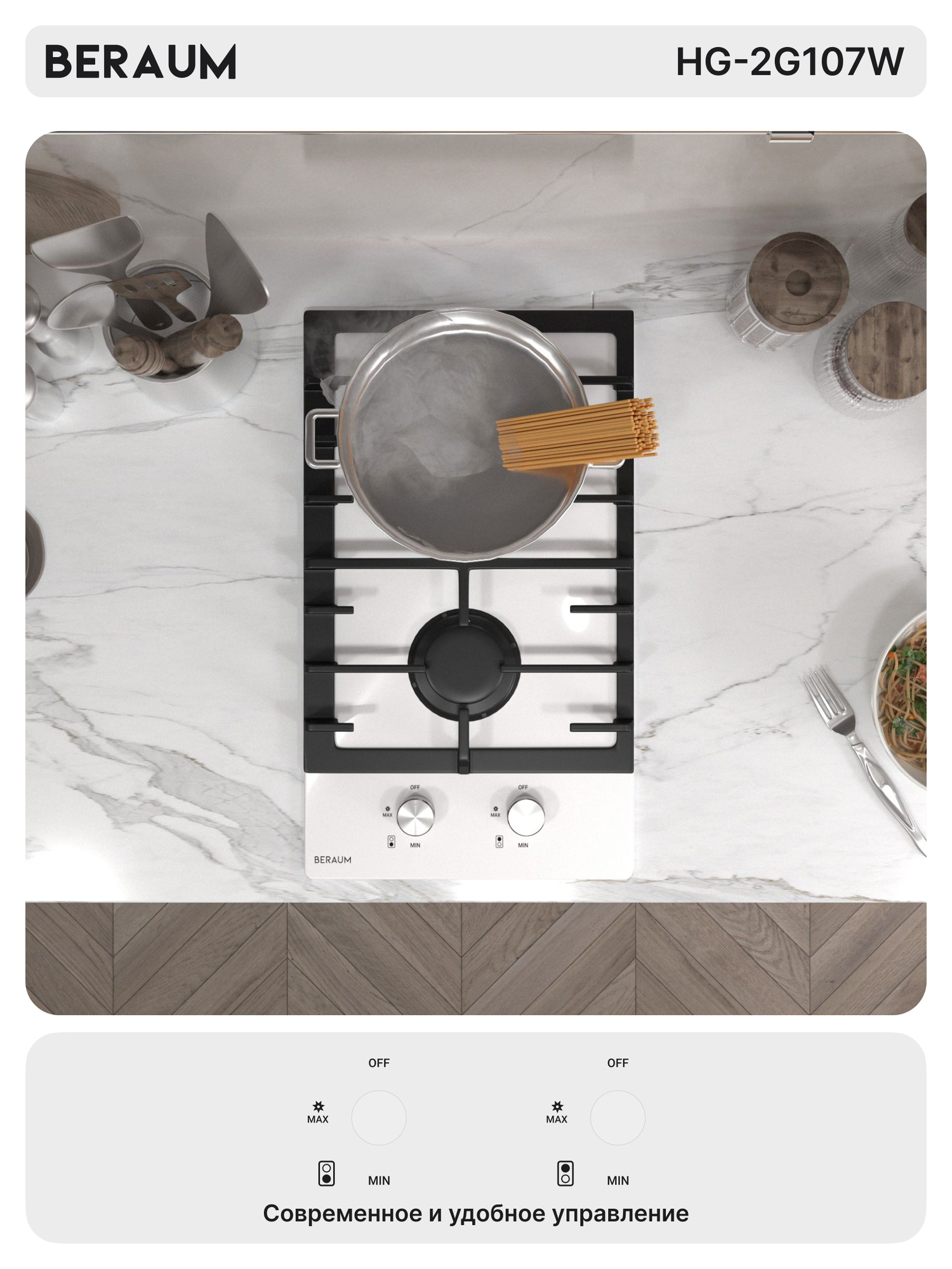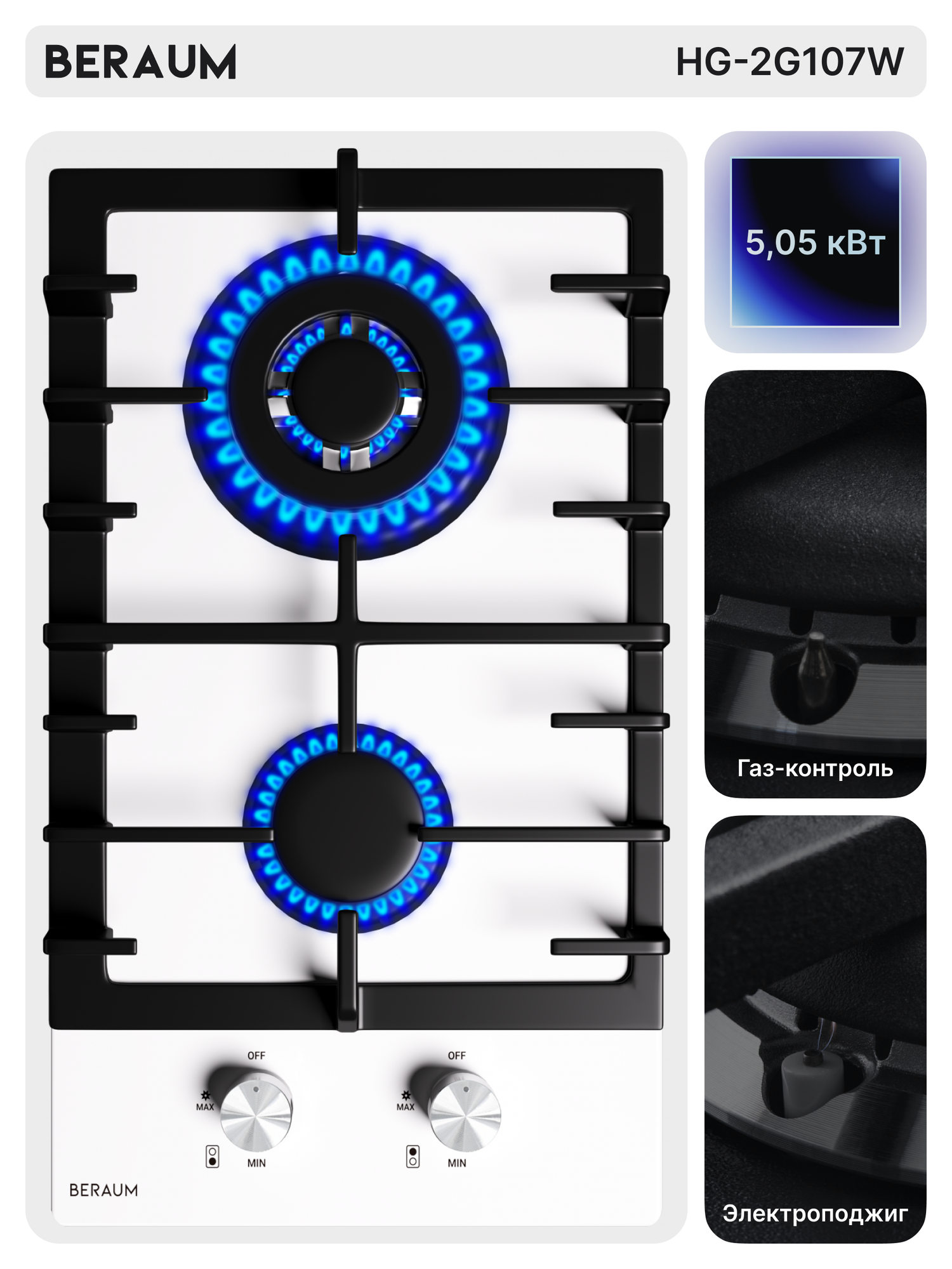Газовая варочная панель Beraum HG-2G107W, 2 конфорки, газ-контроль, белый информация: