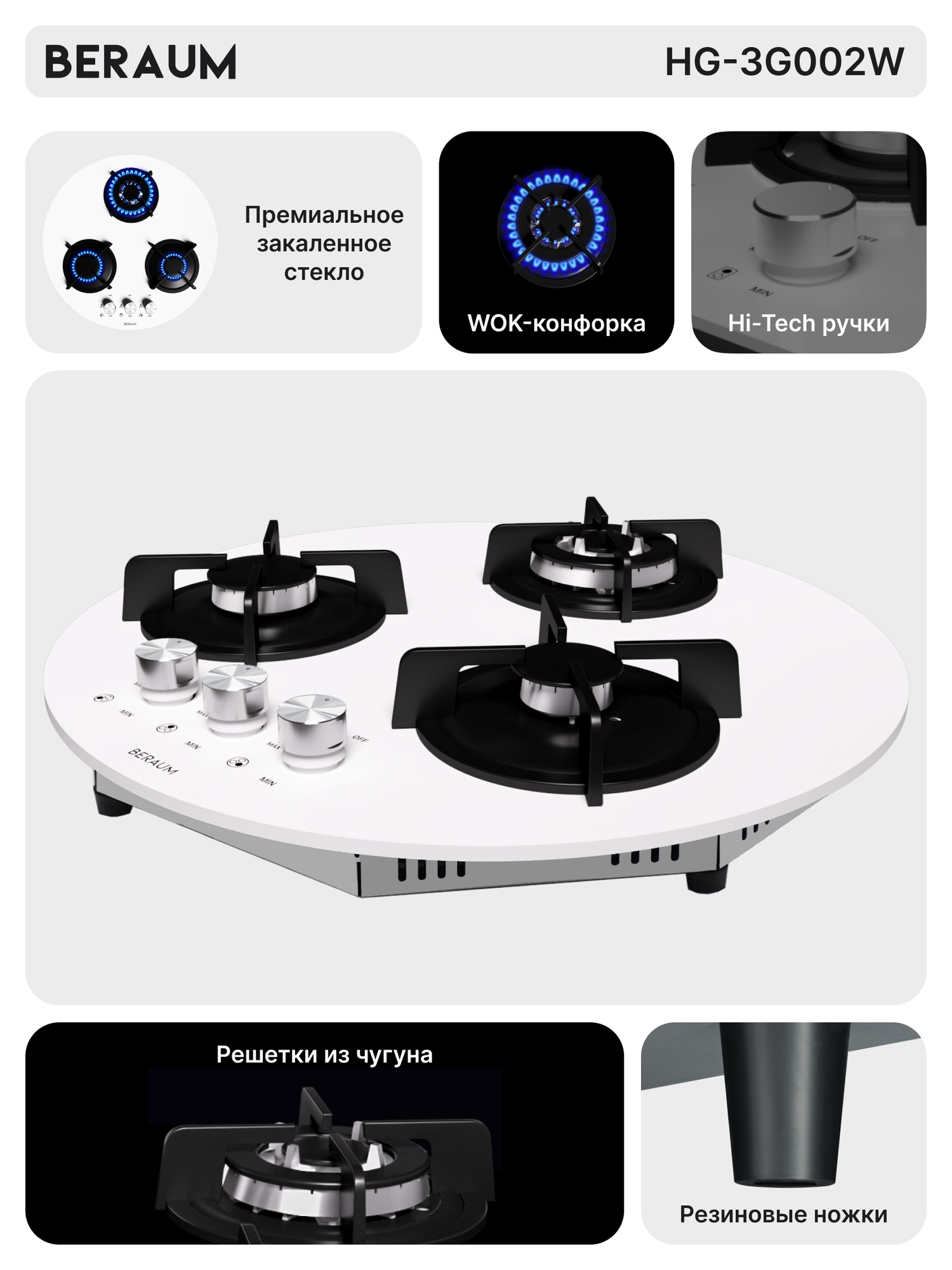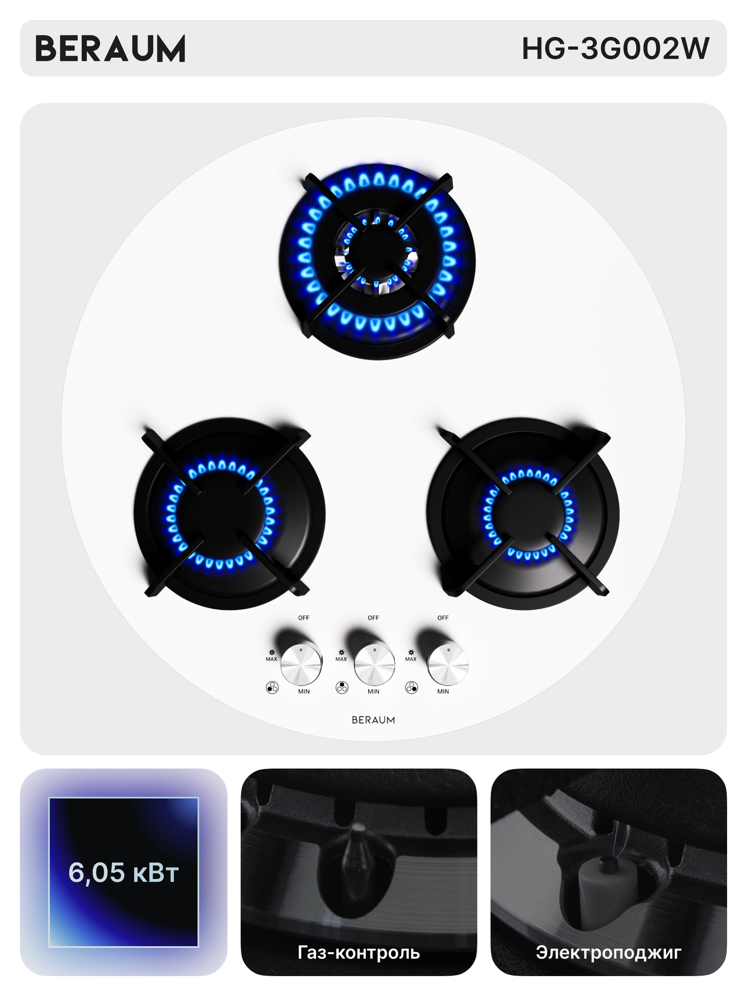 Газовая варочная панель круглая Beraum HG-3G002W, 3 конфорки, газ-контроль, белый информация: