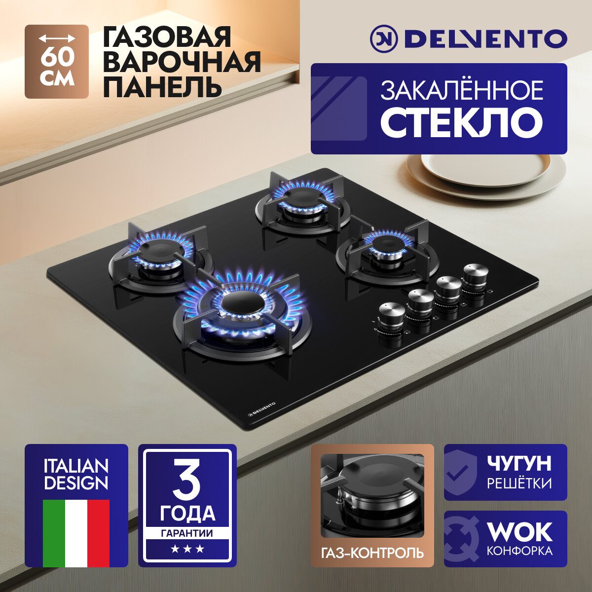 Отзывы на Встраиваемая газовая варочная панель 60см DELVENTO V60N41S100 газ-контроль, автоподжиг, чугунная решетка, WOK