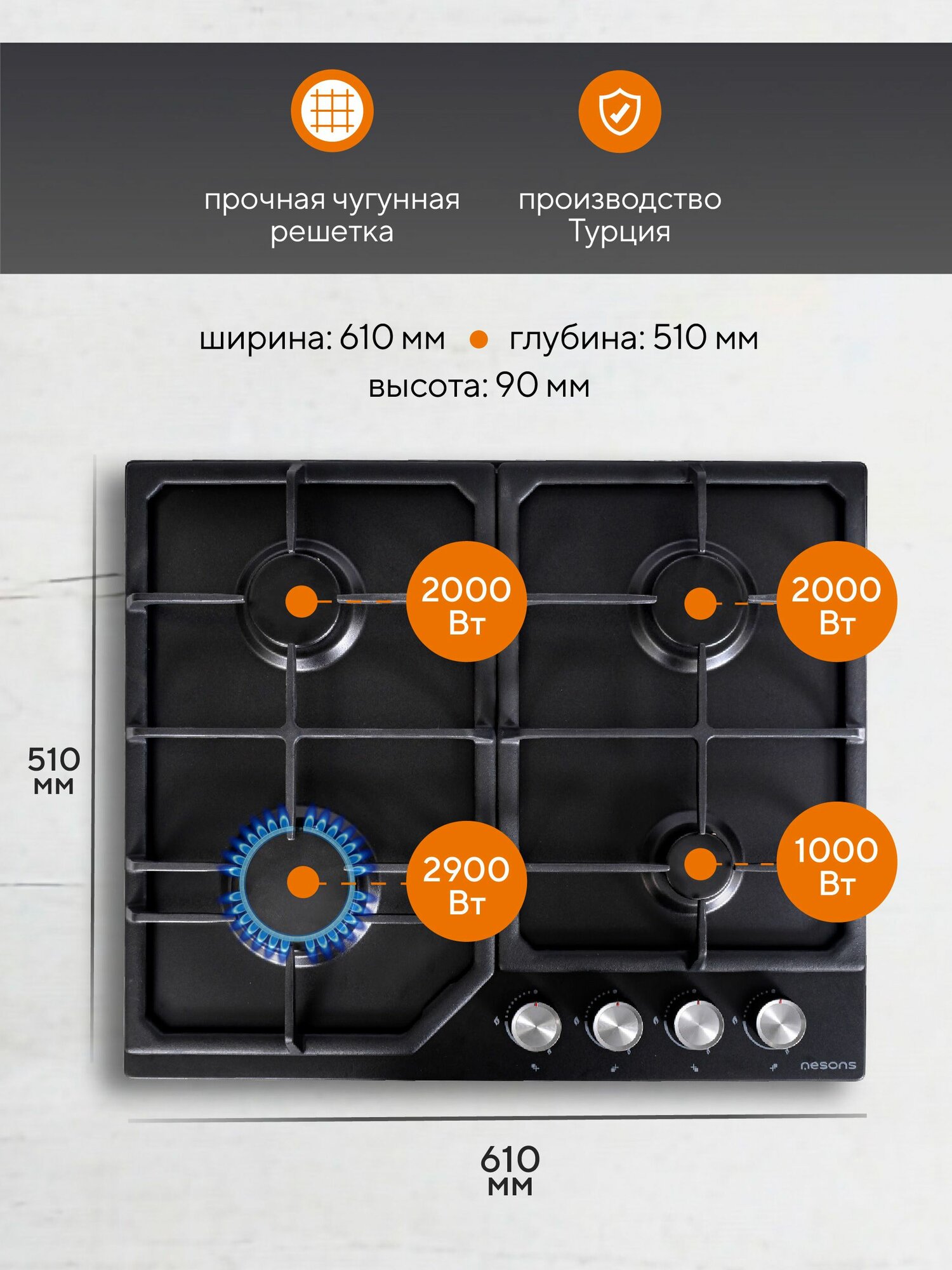 Варочная панель газовая 4 конфорки Nesons NS-HGF60MC BL черная информация: