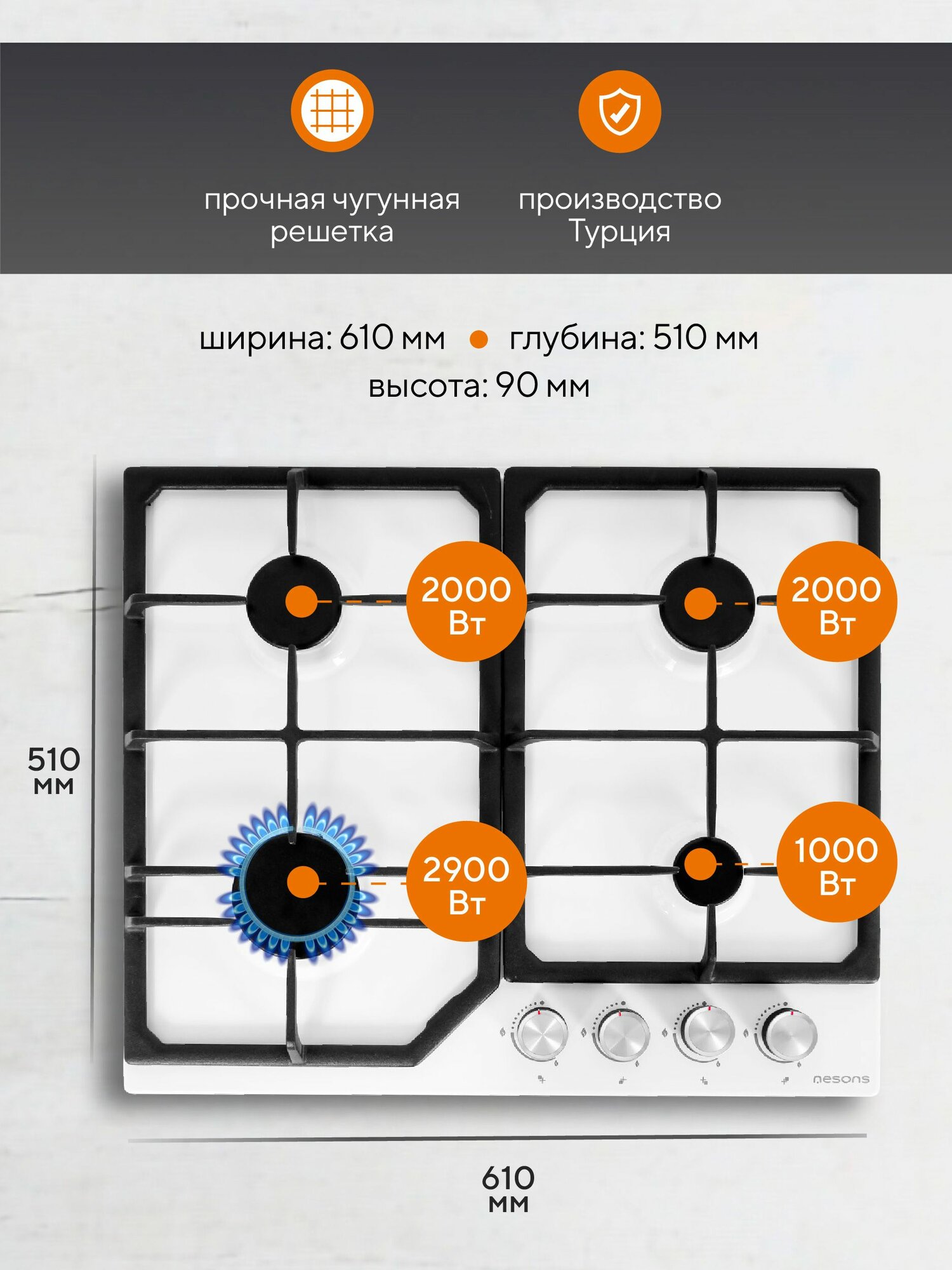 Варочная панель газовая 4 конфорки Nesons NS-HGF60MC WH белая информация: