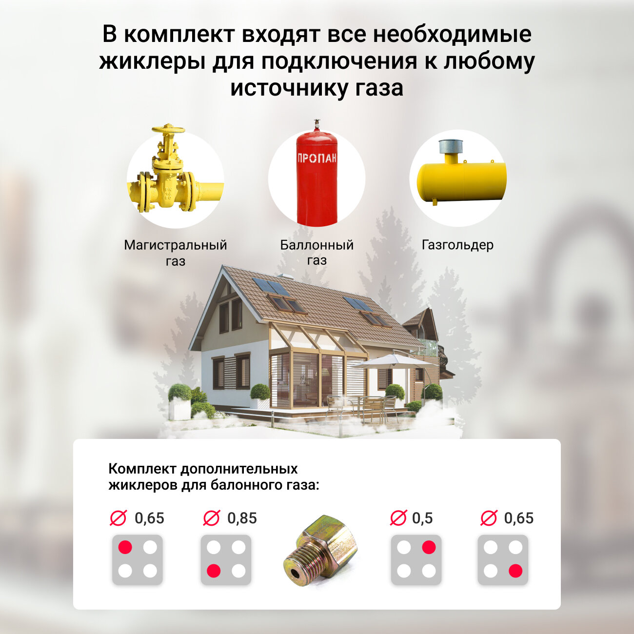 | Комплектация | Варочная панель, набор жиклеров для сжиженного газа, переходник для подключения шланга |