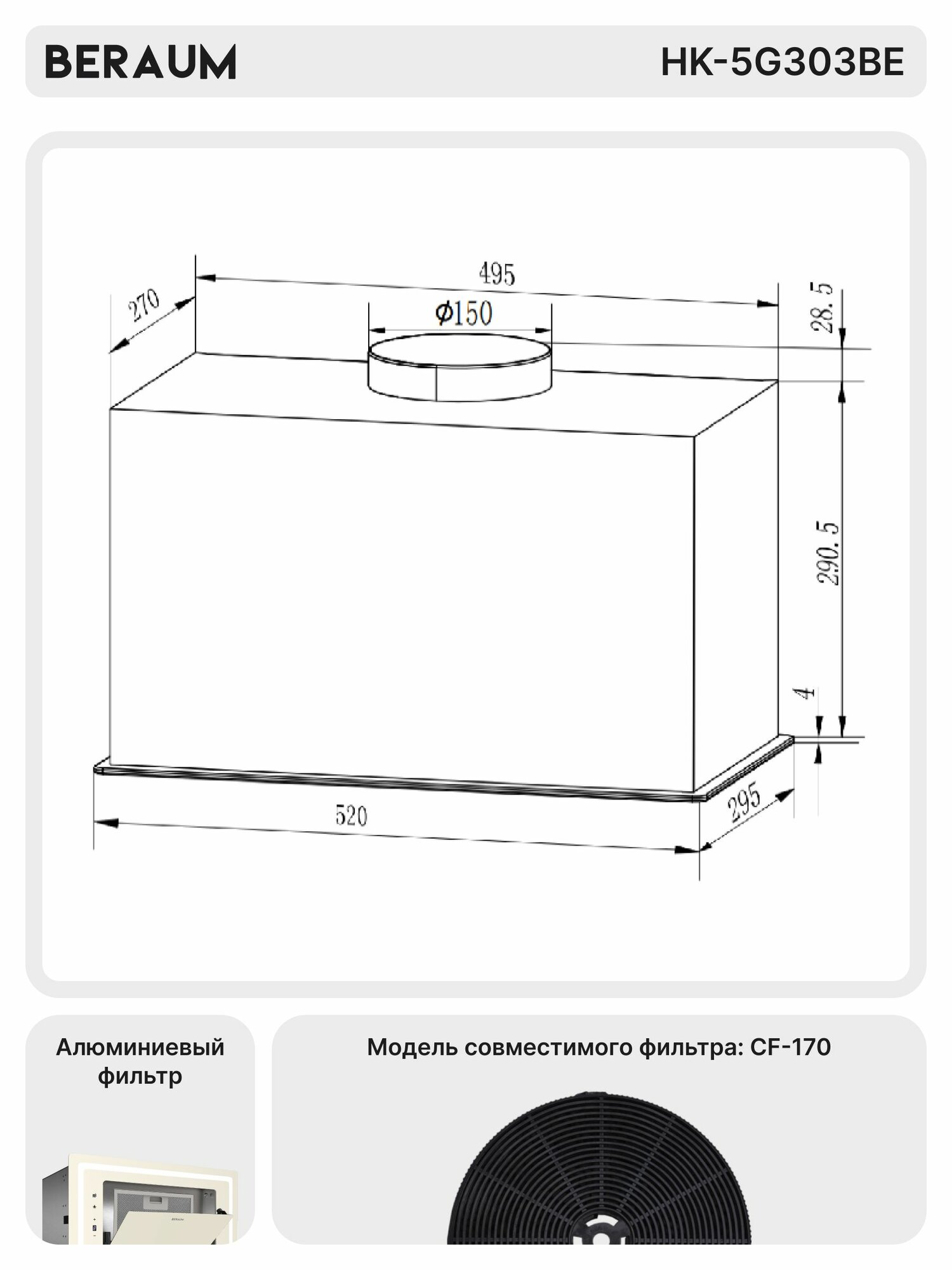 Вытяжка встраиваемая Beraum HK-5G303BE, сенсорное управление и пульт ДУ, инверторный двигатель информация: