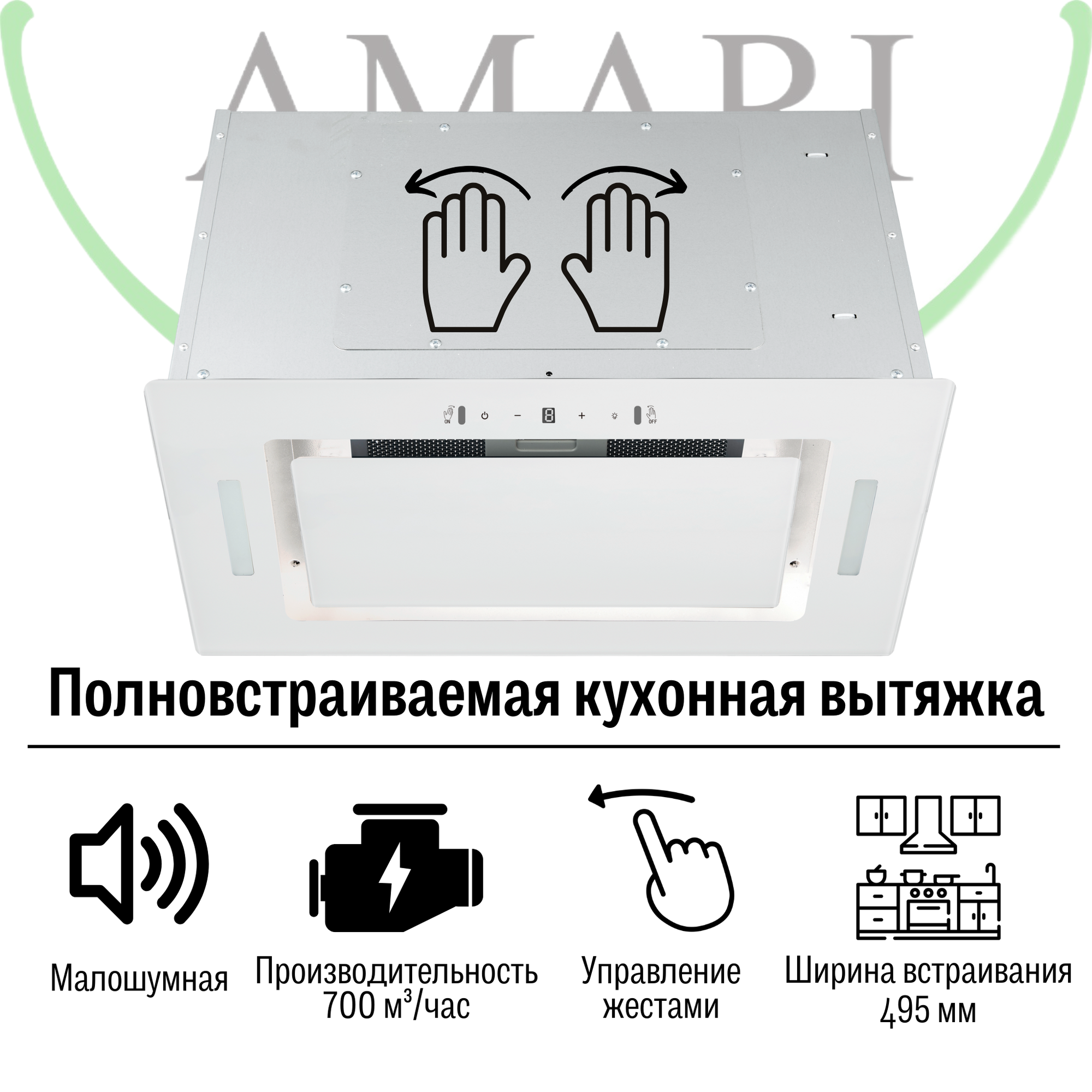Вытяжка кухонная встраиваемая AMARI POLO 50 см белая с управлением с помощью жестов, подсветкой, малошумным двигателем информация: