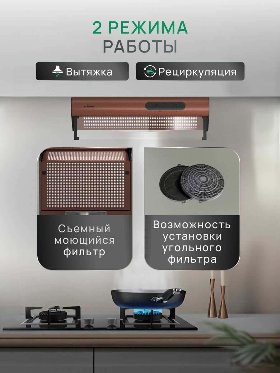 Отзывы на Вытяжка кухонная 60 см встраиваемая, 290 м3/ч, цвет медь, ELIKOR Davoline 60П-290-П3Л, 3 скорости, управление ползунковое, лампа накаливания