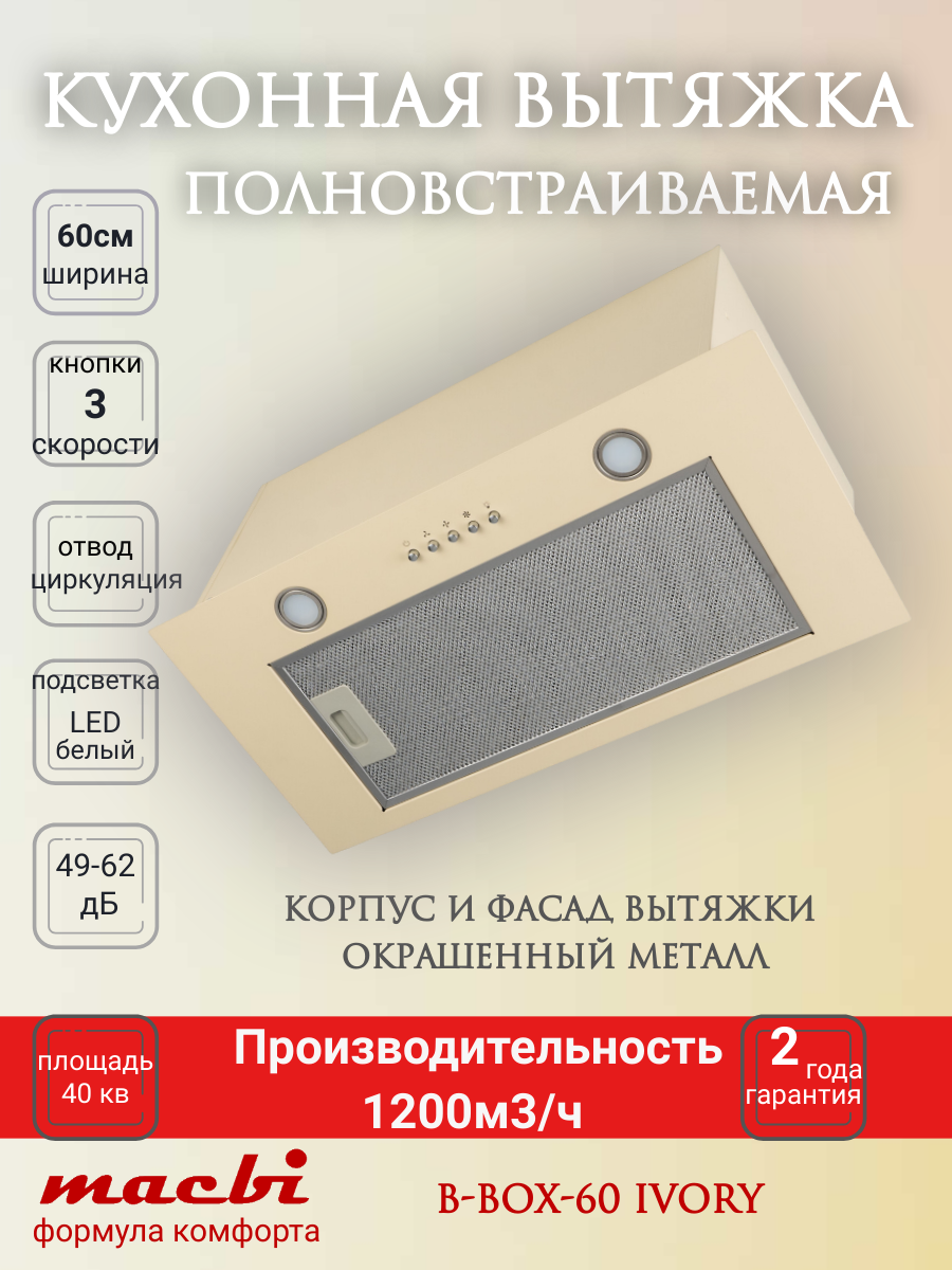 Вытяжка кухонная MACBI B-BOX-60 (IVORY) слоновая кость, металл, 1200 м3/ч информация: