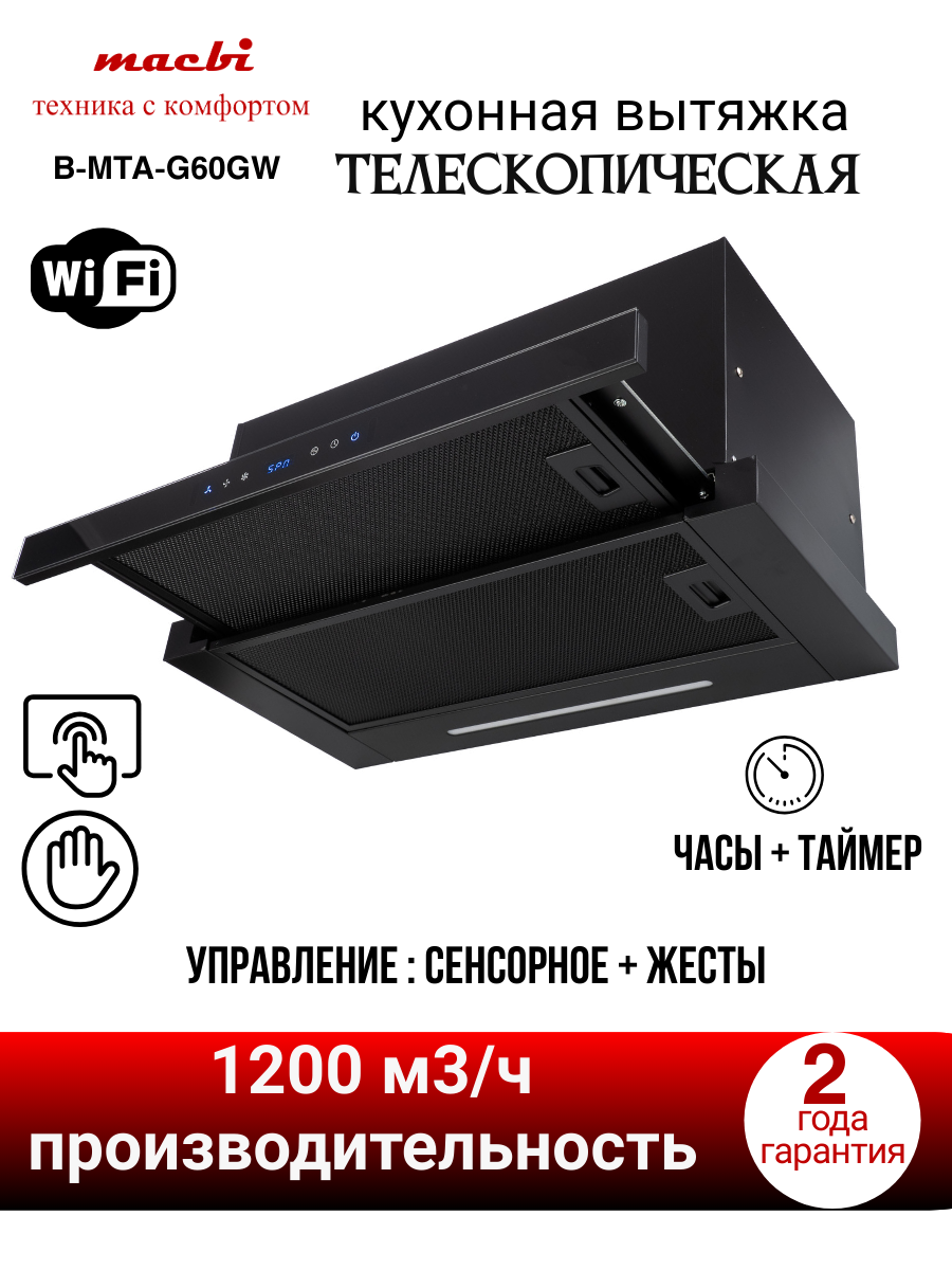 Кухонная вытяжка MACBI B-MTA-G60GW BL1200м3/ч Черная, Жесты+Wi-Fi, выдвижная информация: