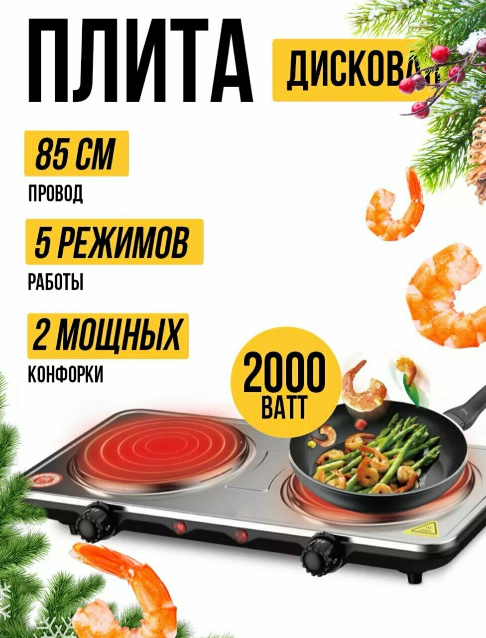 Плита электрическая, настольная, 2 конфорки, 2000 вт информация: