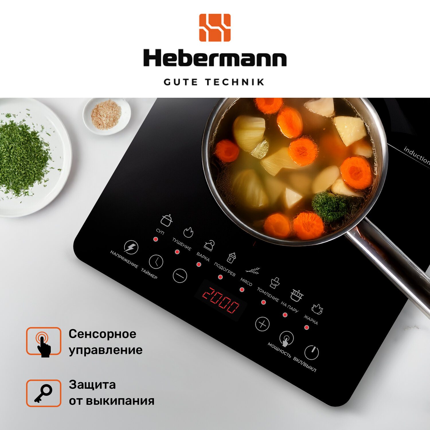Плитка индукционная настольная электрическая Hebermann HBIC 1102. 2000 Вт, 8 автопрограмм, таймер, сенсорное управление, черный глянец. информация:
