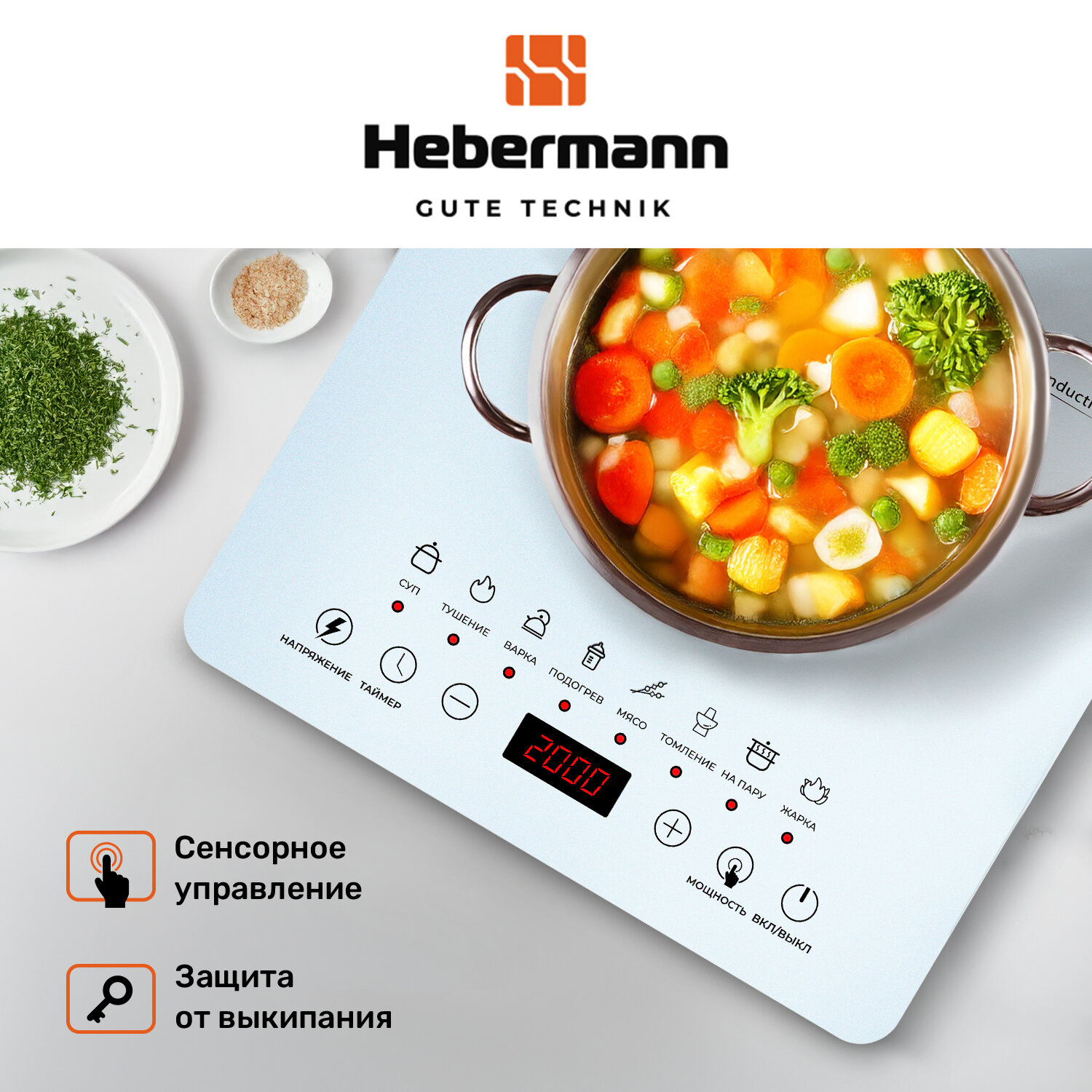 Плитка индукционная настольная электрическая Hebermann HBIC 1103. 2000 Вт, 8 автопрограмм, таймер, сенсорное управление, белая матовая. информация: