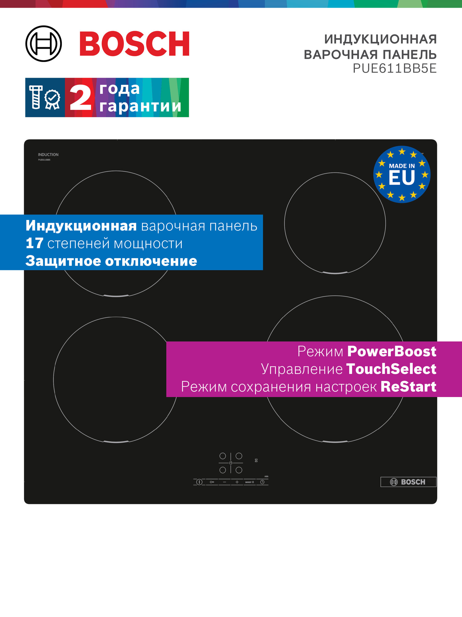 Индукционная варочная панель Bosch Serie 4 PUE611BB5E, стеклокерамика, 17 ступеней мощности информация: