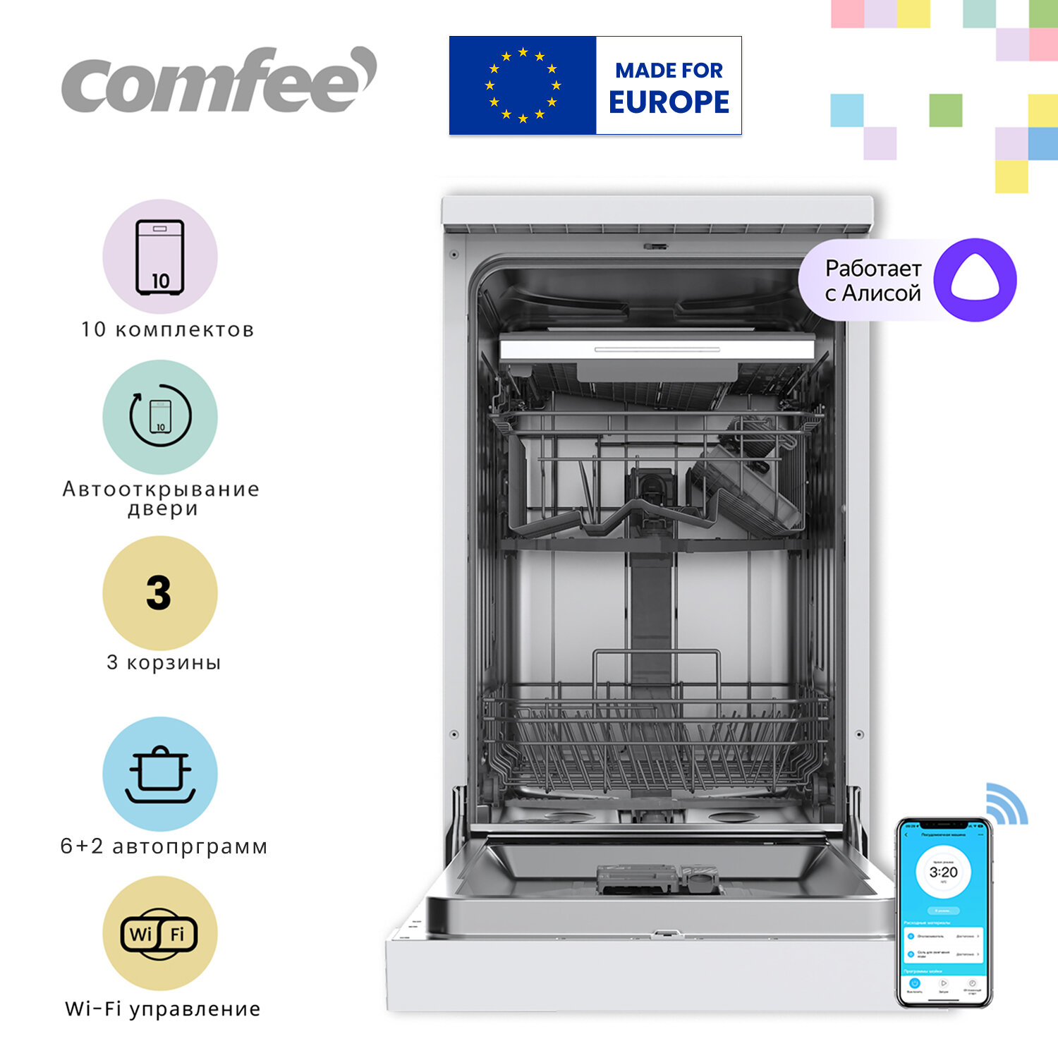 10 цен на Отдельностоящая посудомоечная машина Comfee CDW454Wi, 45 см, 3 корзины, 10 комплектов, 8 программ, Wi-Fi, самоочистка, автооткрывание двери