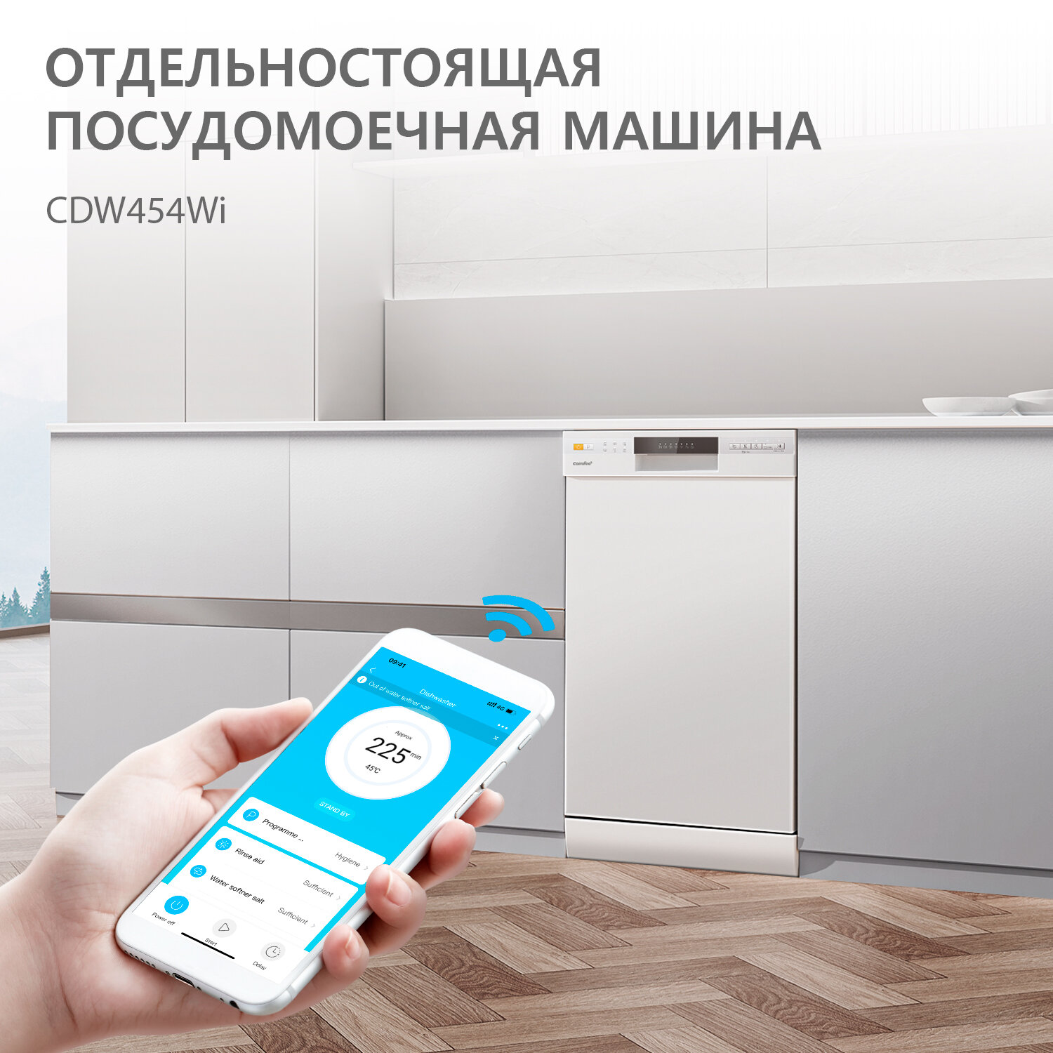 Отдельностоящая посудомоечная машина Comfee CDW454Wi, 45 см, 3 корзины, 10 комплектов, 8 программ, Wi-Fi, самоочистка, автооткрывание двери информация: