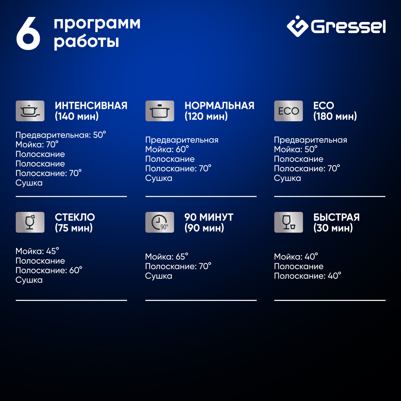 | Программы | быстрая / интенсивная / стекло / экономичная / 90 минут / нормальная |
