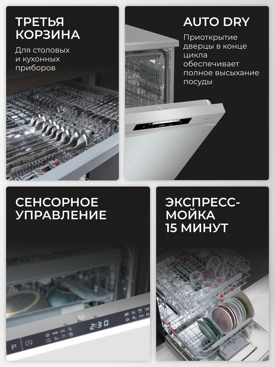 | Особенности конструкции | дисплей / использование средств 3 в 1 / регулируемая по высоте корзина для посуды / сенсор чистоты воды / таймер отсрочки |