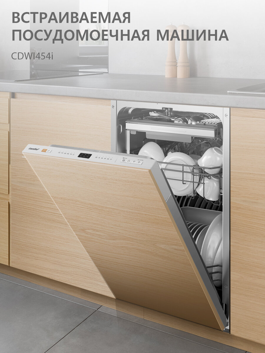 Встраиваемая посудомоечная машина Comfee CDWI454i, 45 см, 3 корзины, 10 комплектов, 8 программ, луч на полу, Wi-Fi, автооткрывание двери информация:
