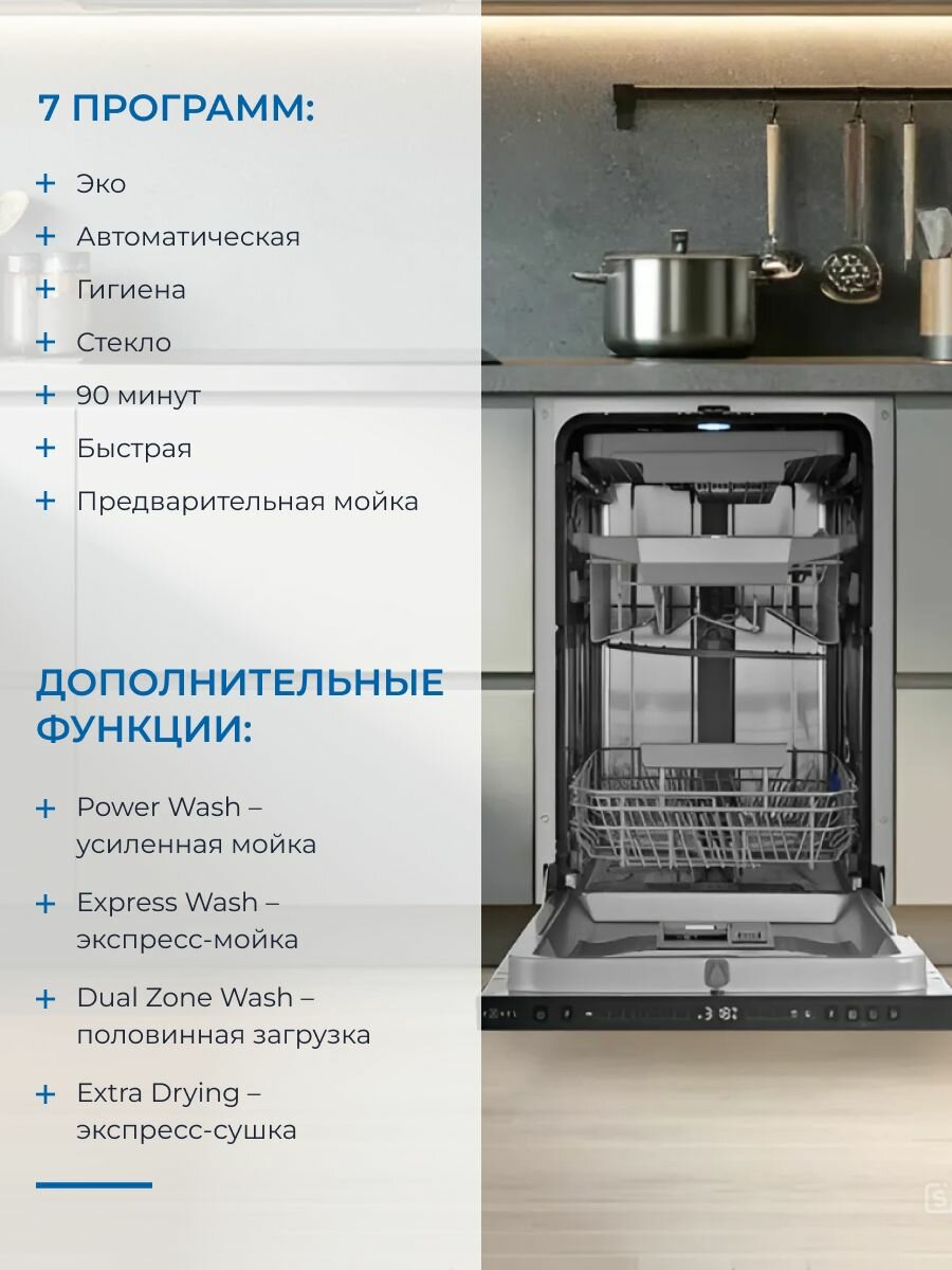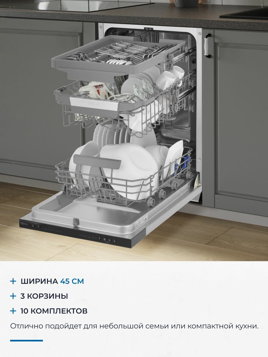 Встраиваемая посудомоечная машина ZUGEL ZDI457 Узкая 45 см, лучом на полу, авто-открыванием, 10 комплектов, 7 программ информация: