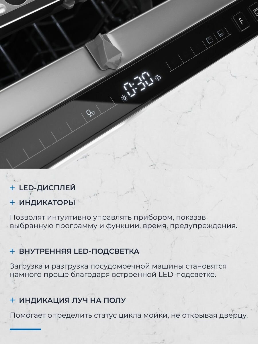 | Особенности конструкции | дисплей / использование средств 3 в 1 / Автоматическое открывание двери / Внутреннее освещение / Возможность добавления посуды после запуска / Отключение звукового сигнала / Отсрочка запуска / Поддон для столовых приборов / полка для чашек / Таймер |