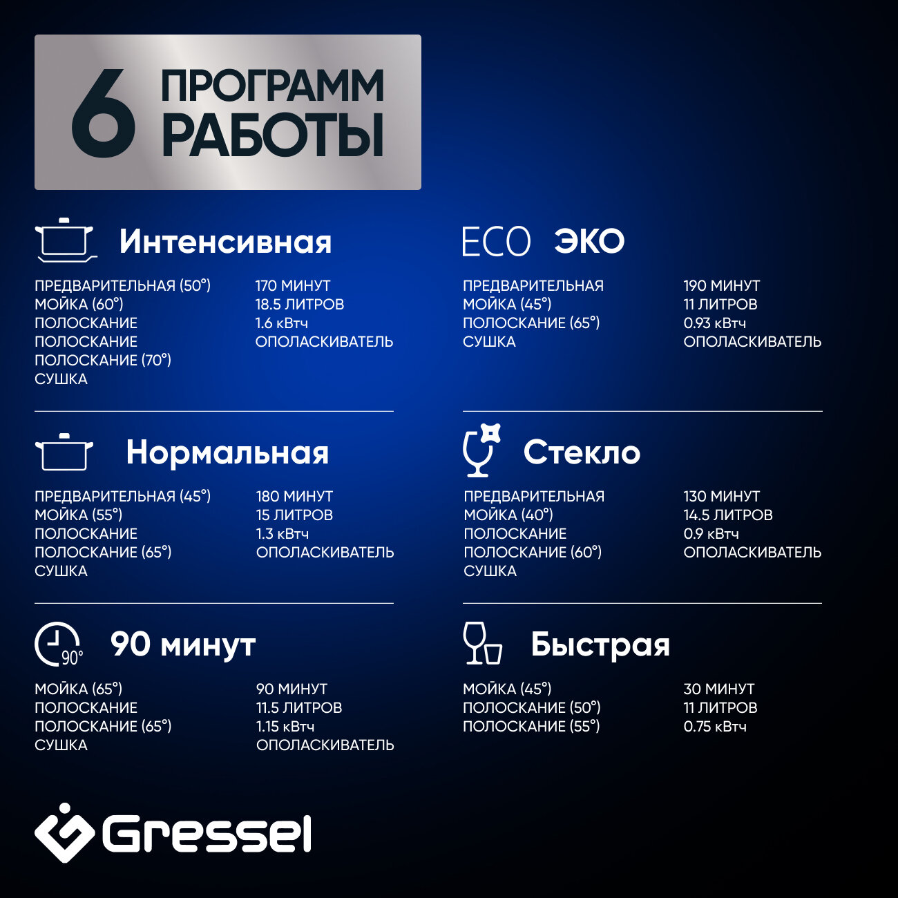 | Программы | быстрая / интенсивная / стекло / 90 минут / нормальная / Эко |
