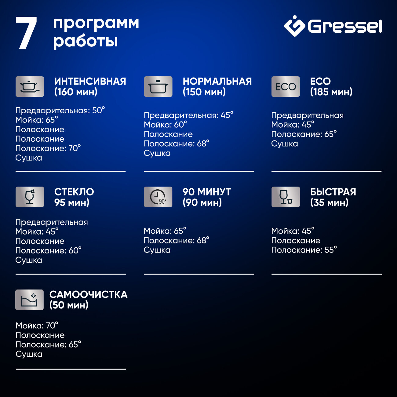 | Программы | быстрая / интенсивная / программа самоочистки / стекло / 90 минут / нормальная / Эко |
