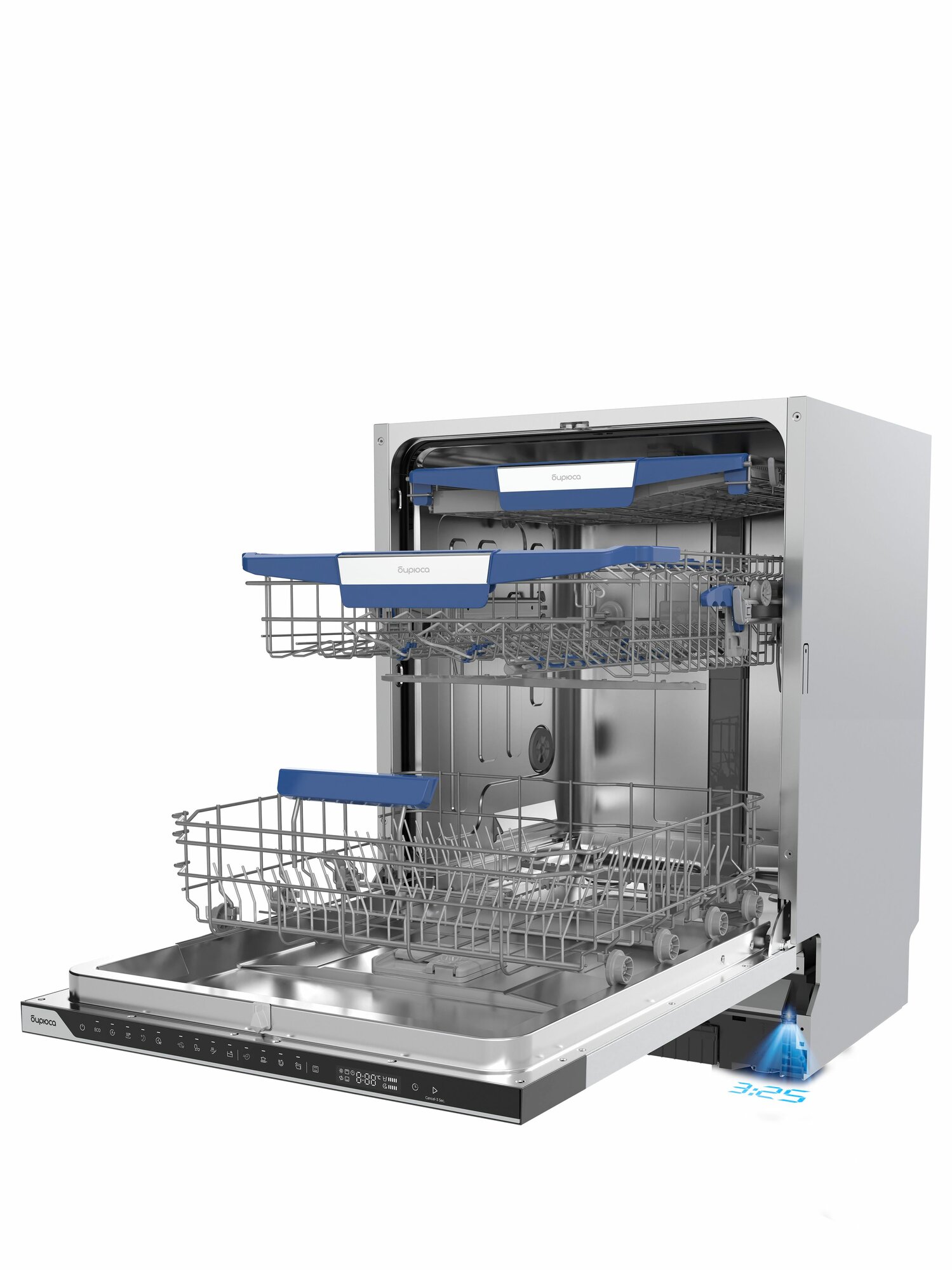 Встраиваемая посудомоечная машина Бирюса, 60см, 14 комплектов, 3 корзины, зона мойки бутылок, автооткрывание, самоочистка, луч на полу информация: