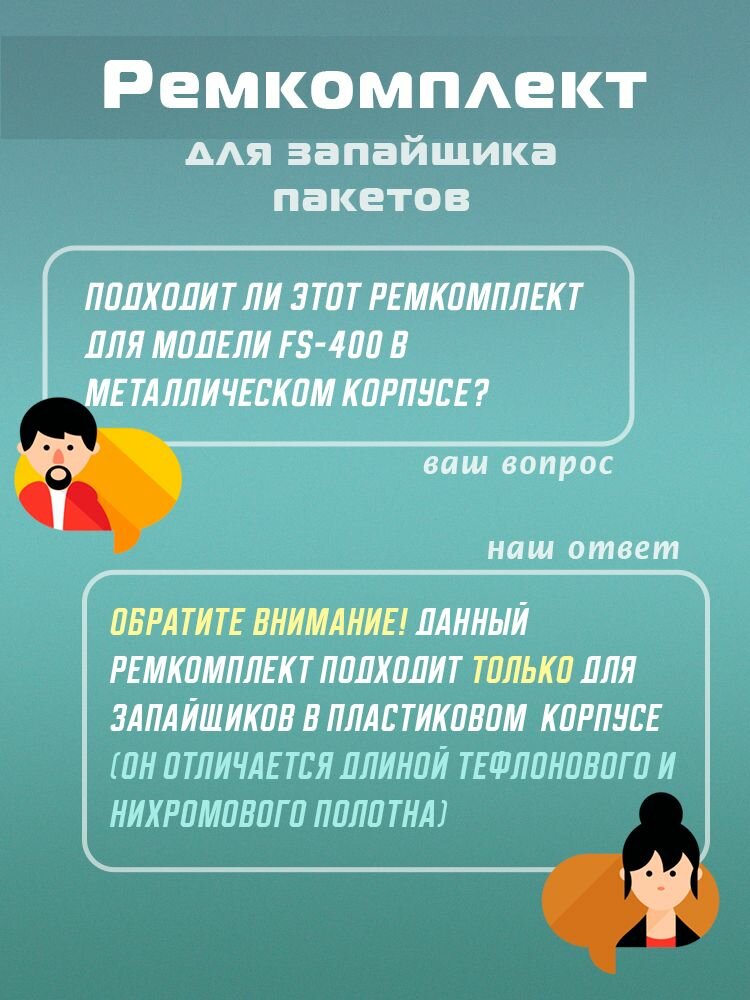 Отзывы на Ремкомплект для запайщика пакетов FS-400 (в пластиковом корпусе) антипригарное полотно 2шт и нагревательный элемент 2шт