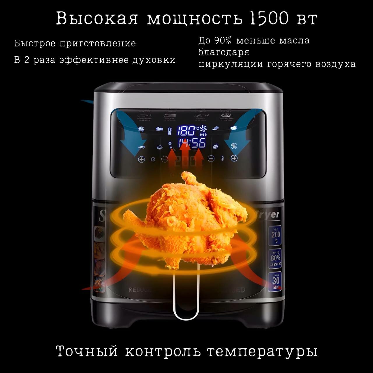 Аэрогриль Аэрогриль электрический 7 литров, с сенсорной панелью, 2400 Вт аэрогриль электрический, черный, серебристый