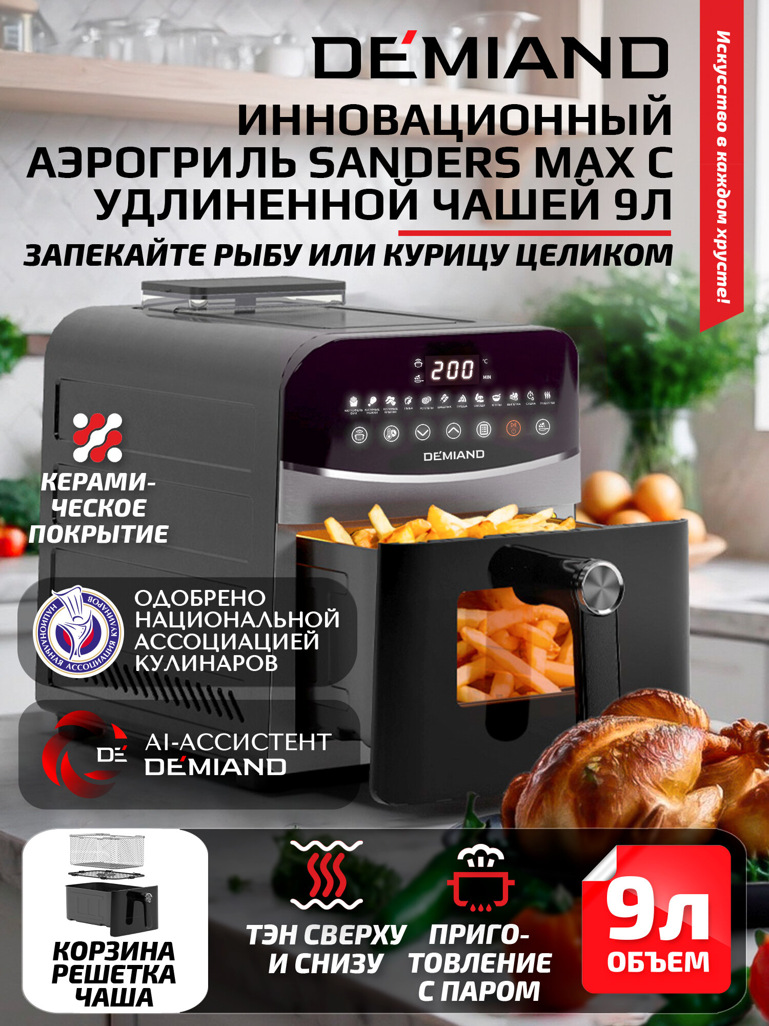 Инновационный аэрогриль DEMIAND SANDERS с технологией приготовления на Пару, чаша на 6 литров, разморозка, визуальное окно, сенсорная панель, стальной корпус, 1950W, DK-2200, черный 17 100 ₽