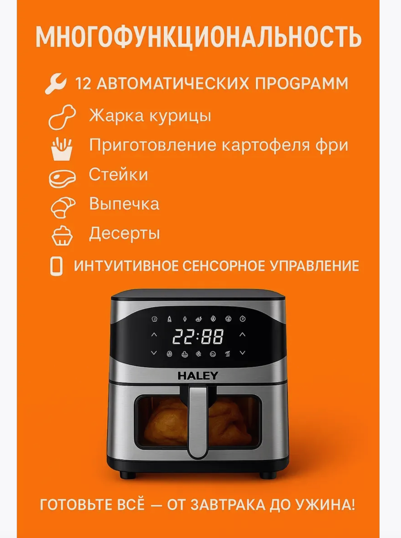 HALEY-2511 Аэрогриль электрический 8 в 1, объем 10 л, мощность 2000 Вт, мультипечь 8 программ, с сенсорным управлением