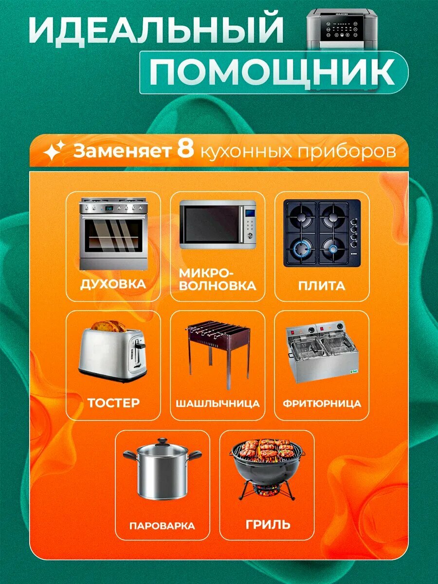 Аэрогриль - Аэрофритюрница DEMIAND kitchen Waison 10 в 1, сенсорная панель,12 программ,9 аксессуаров, книга рецептов,14,5 л,1700Вт, DK-1800