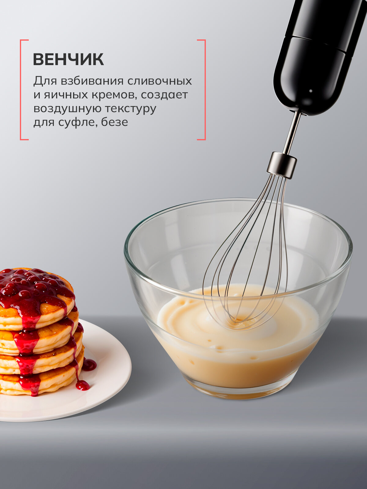 | Насадки | венчик для взбивания / для приготовления пюре / Для взбивания молочной пенки / насадка-блендер |