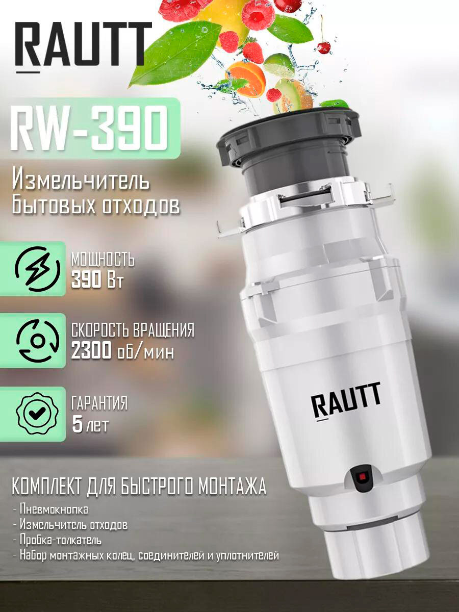 Измельчитель бытовых отходов RAUTT, диспоузер RW390 белый, электрический встраиваемый, 1500 мл кухонный для раковины информация: