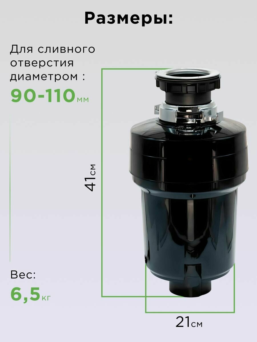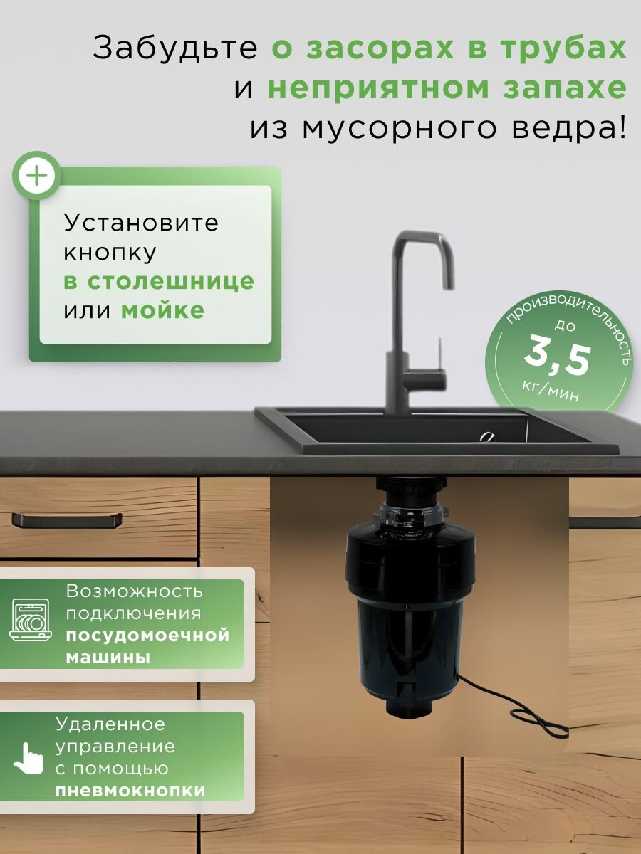 | Комплектация | Измельчитель, пневмокнопка, кабель питания, инструкция по установке, сетка-крышка-толкатнль, выпускное колено, съёмный брызговик |